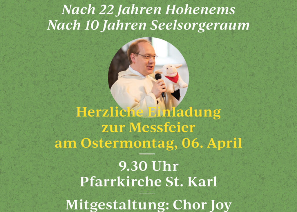 Herzliche Einladung zur Messfeier am Ostermontag um 9.30 Uhr in der Pfarrkirche St. Karl, anlässlich der Verabschiedung von Pfarrer Tomas Heilbrun.