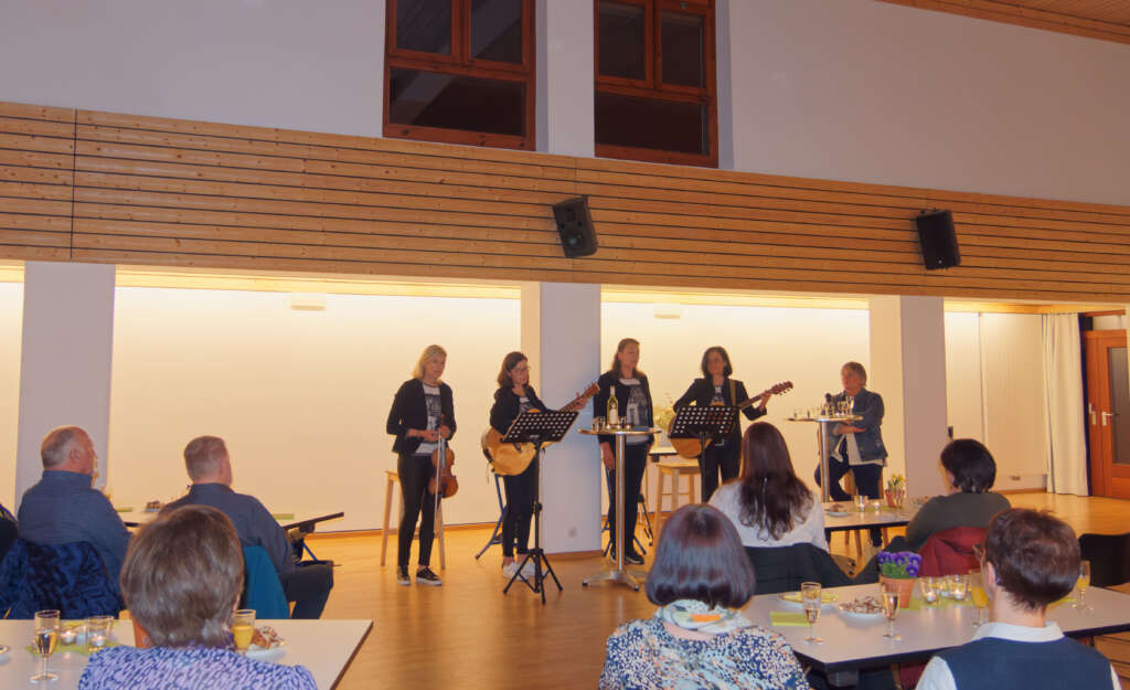 Nach einer kurzen Begrüßung durch Patricia Tschallener übernahm Katharina Waibel die Moderation und das Interview mit den vier Damen Angelika Jaud, Angelika Scheichl, Gertraud Gächter und Uschi Bell, das immer wieder durch Gesang mit und ohne Instrumente ergänzt wurde. Diverse Fragen wurden direkt beantwortet, andere Informationen kamen für die Anwesenden durch die Lieder selbst: Die „Nette Begegnung“, die „Zwischen Himmel und Erde“ bei einem „Likörchen“ stattfinden kann, kann „eigentlich“ genauso gut mit einem Glas „Griechischem Wein“ gefeiert werden. „Zit isch do“, dachten sich die Sängerinnen, den Frühling zu begrüßen und den Winter zu verabschieden, und passend haben sie dazu noch das „Emserlied“ und ein „Irisches Abschiedslied“ gesungen.