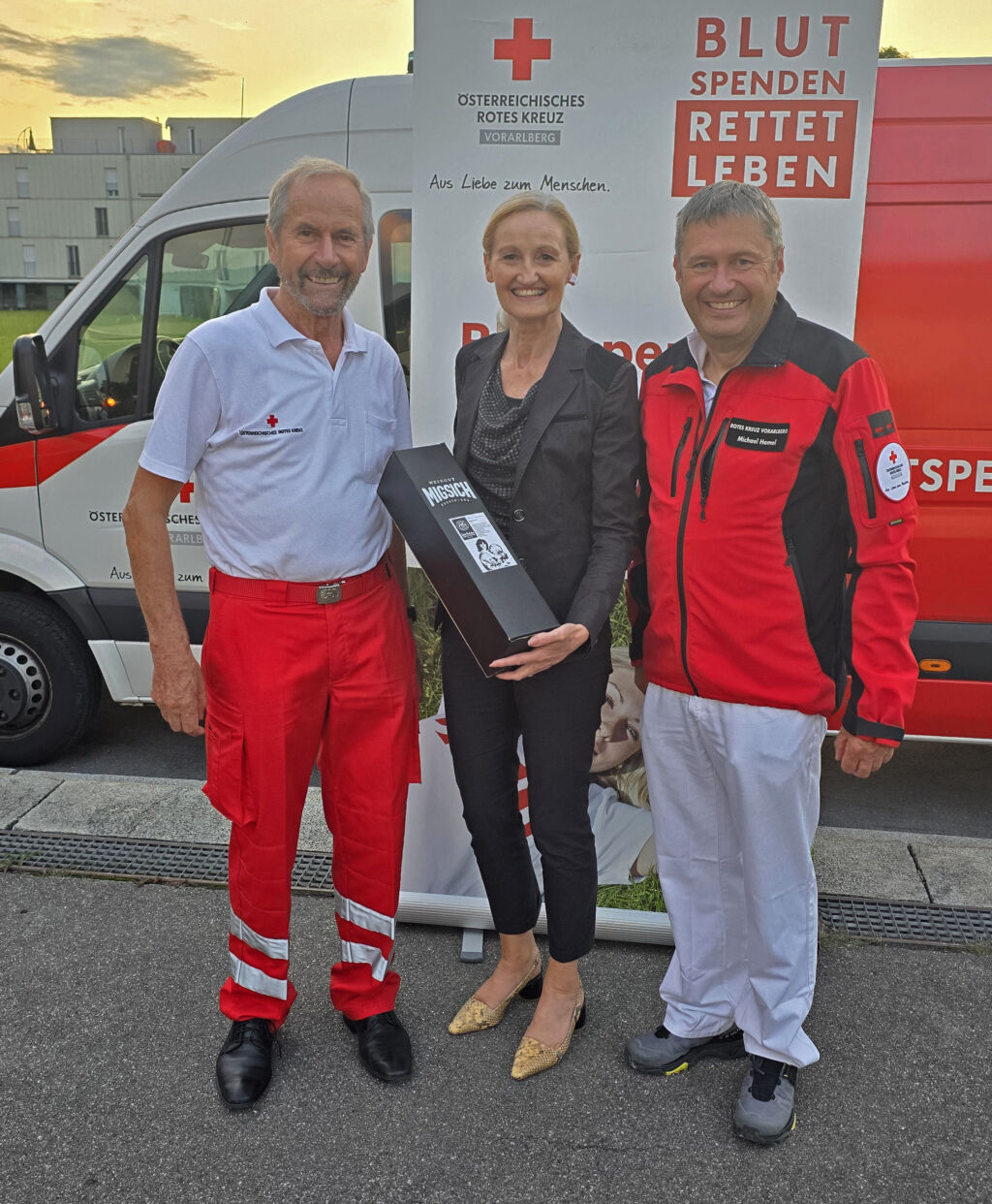 Zudem konnte noch eine seltene Ehrung von der Blutbank Feldkirch durch deren Leiter Michael Hamel und Ehrenkommandant Norbert Rücker durchgeführt werden. Sabine Mohr-Egger wurde als 15.000. Spenderin seit der Führung der Spenderliste 1993 mit einer besonderen Flasche Wein beschenkt.