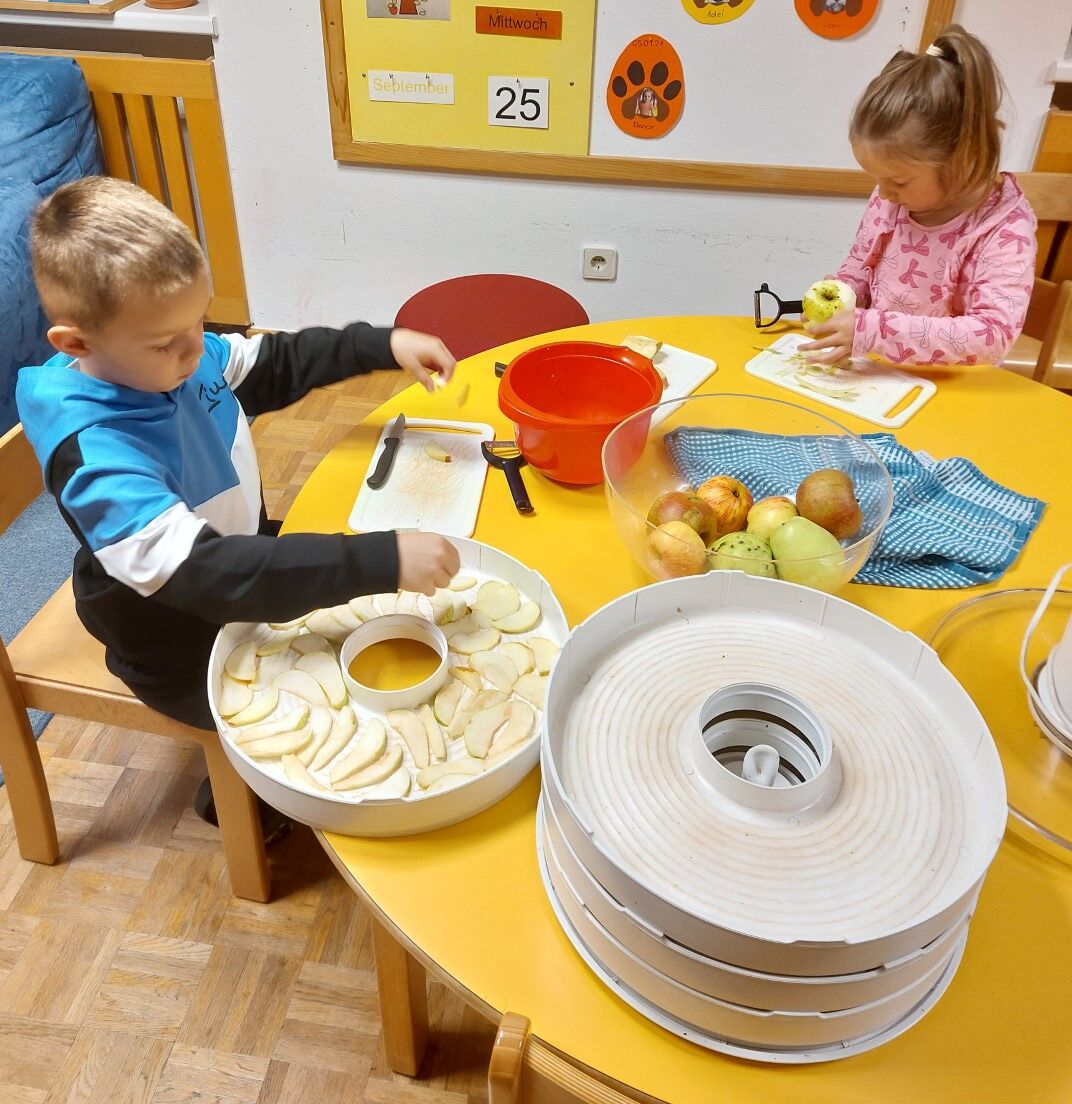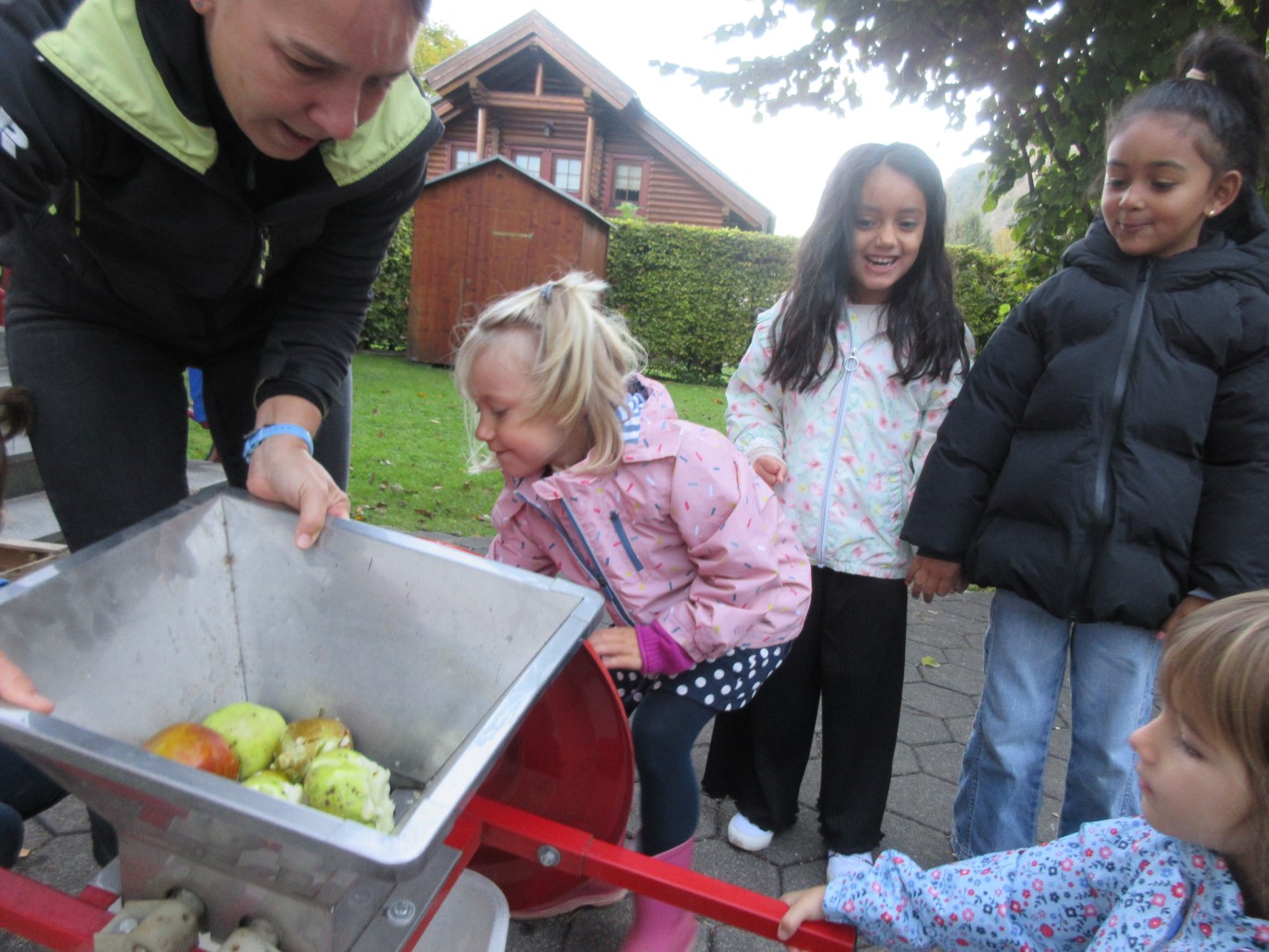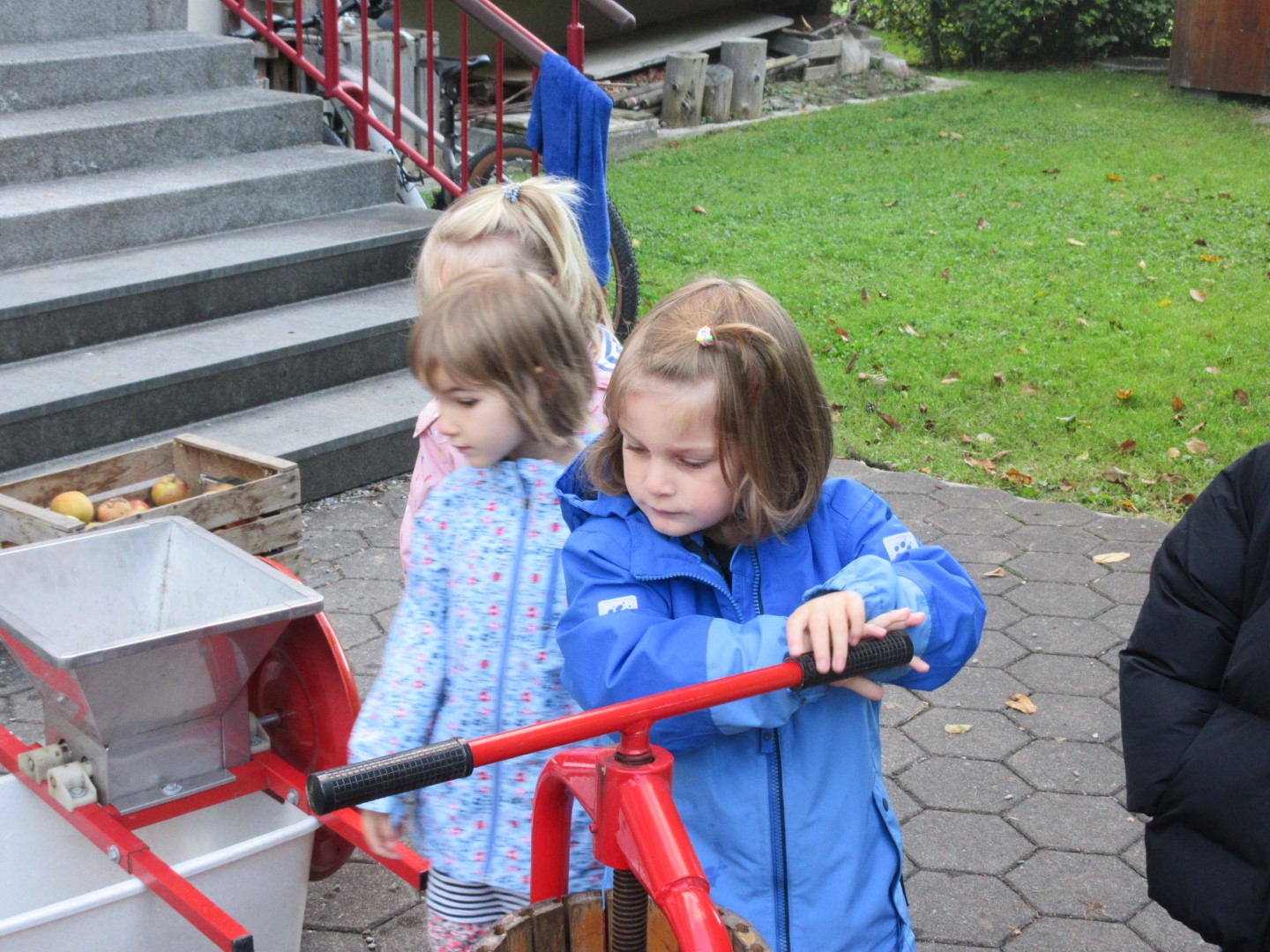 Zuerst noch sprachlich mit Liedern, Fingerspielen und einem Sachbilderbuch und anschließend in vielen praktischen Teilen. Verschiedene Apfelbäume auf den Wiesen betrachten. Äpfel selbst zu Most verarbeiten (hier ein Dank an den Obst und Gartenbauverein, der die Presse zur Verfügung stellte). Äpfel dörren und aus Apfelschalen Tee kochen. Einen Apfelkuchen backen und die Mosterei Klien in Hohenems besuchen. Und natürlich haben die Kinder den Kindergarten auch mit selbstgemalten Bäumen und Äpfeln herausgeputzt!