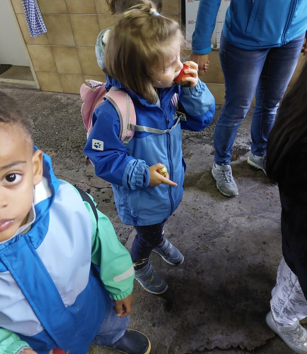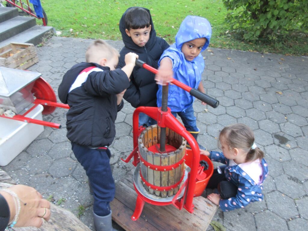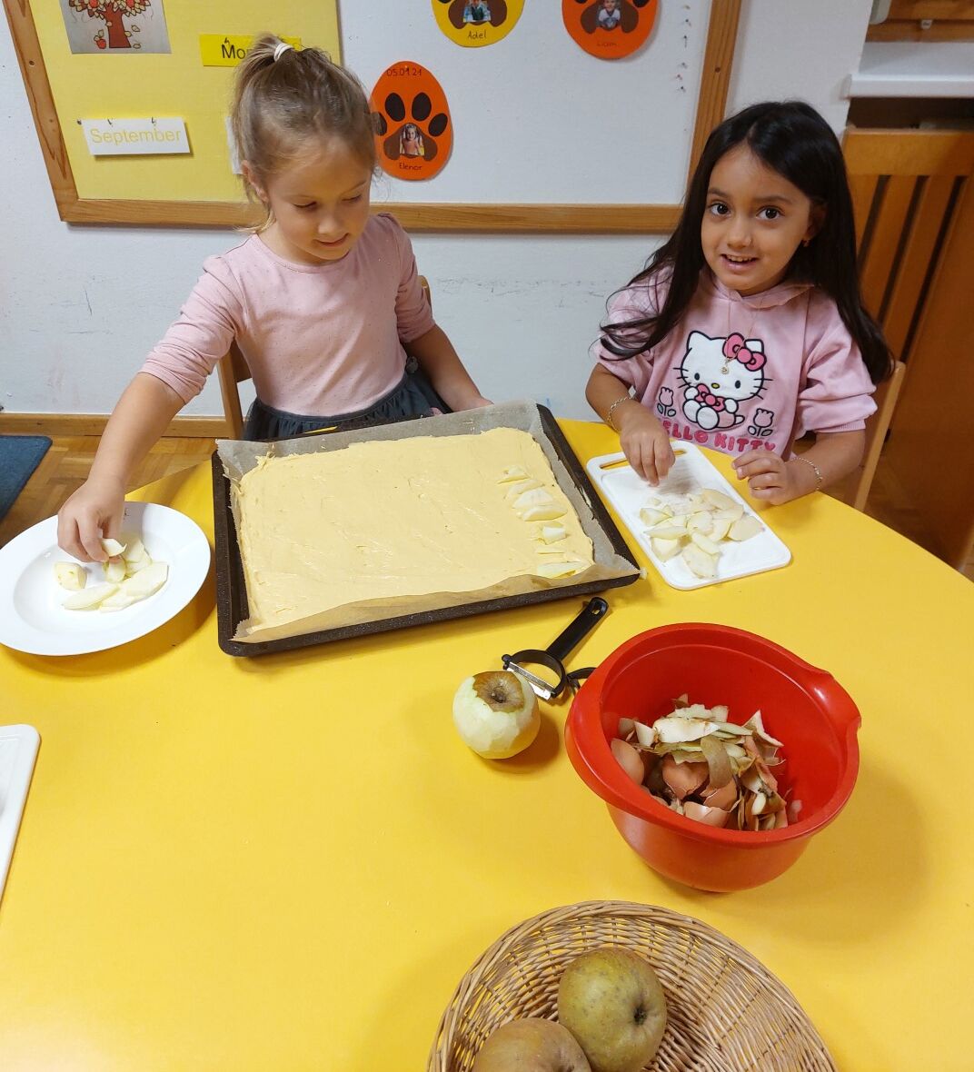 Zuerst noch sprachlich mit Liedern, Fingerspielen und einem Sachbilderbuch und anschließend in vielen praktischen Teilen. Verschiedene Apfelbäume auf den Wiesen betrachten. Äpfel selbst zu Most verarbeiten (hier ein Dank an den Obst und Gartenbauverein, der die Presse zur Verfügung stellte). Äpfel dörren und aus Apfelschalen Tee kochen. Einen Apfelkuchen backen und die Mosterei Klien in Hohenems besuchen. Und natürlich haben die Kinder den Kindergarten auch mit selbstgemalten Bäumen und Äpfeln herausgeputzt!