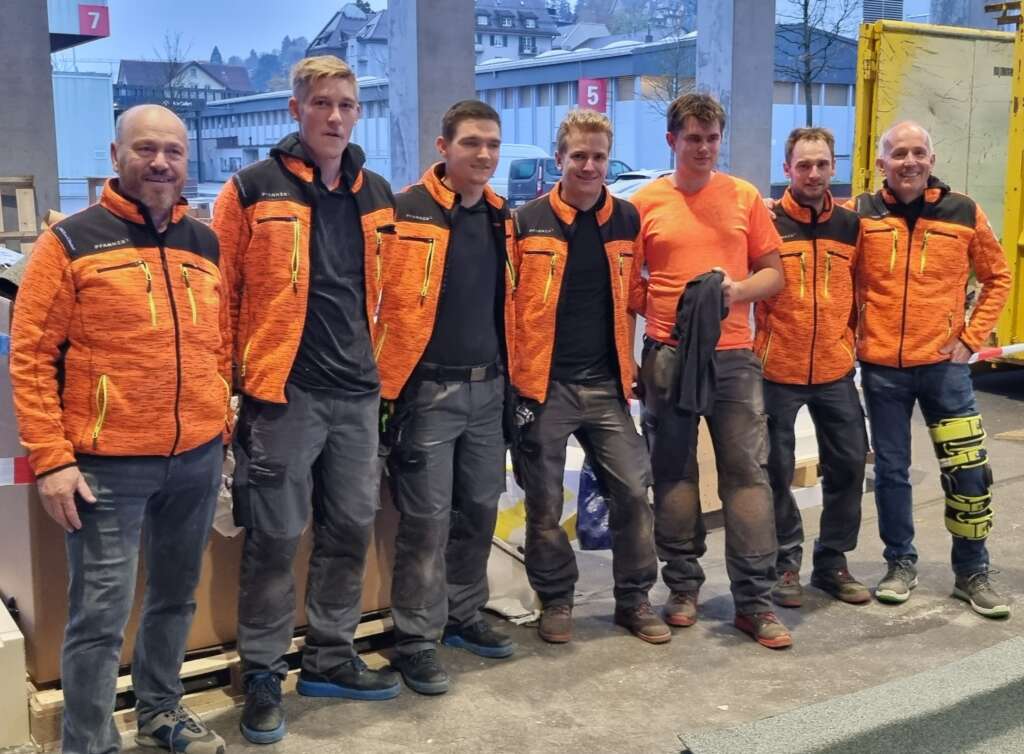 Das gesamte Team Austria: v. l. Team Flachdach: Trainer und Mentor Peter Amann, Fabian Mächler, Patrick Jäger Nemec. Team Steildach: Johannes Latzenhofer, Sebastian Knapp, Trainer und Mentoren Markus Geist und Martin Meusburger; eingekleidet von der Firma Pfanner aus Koblach