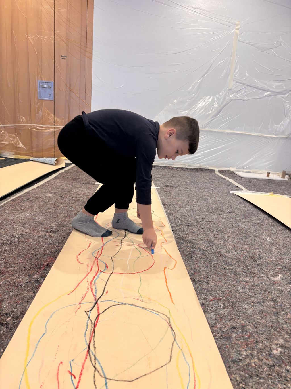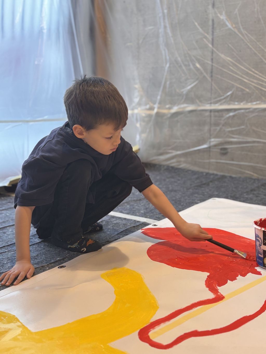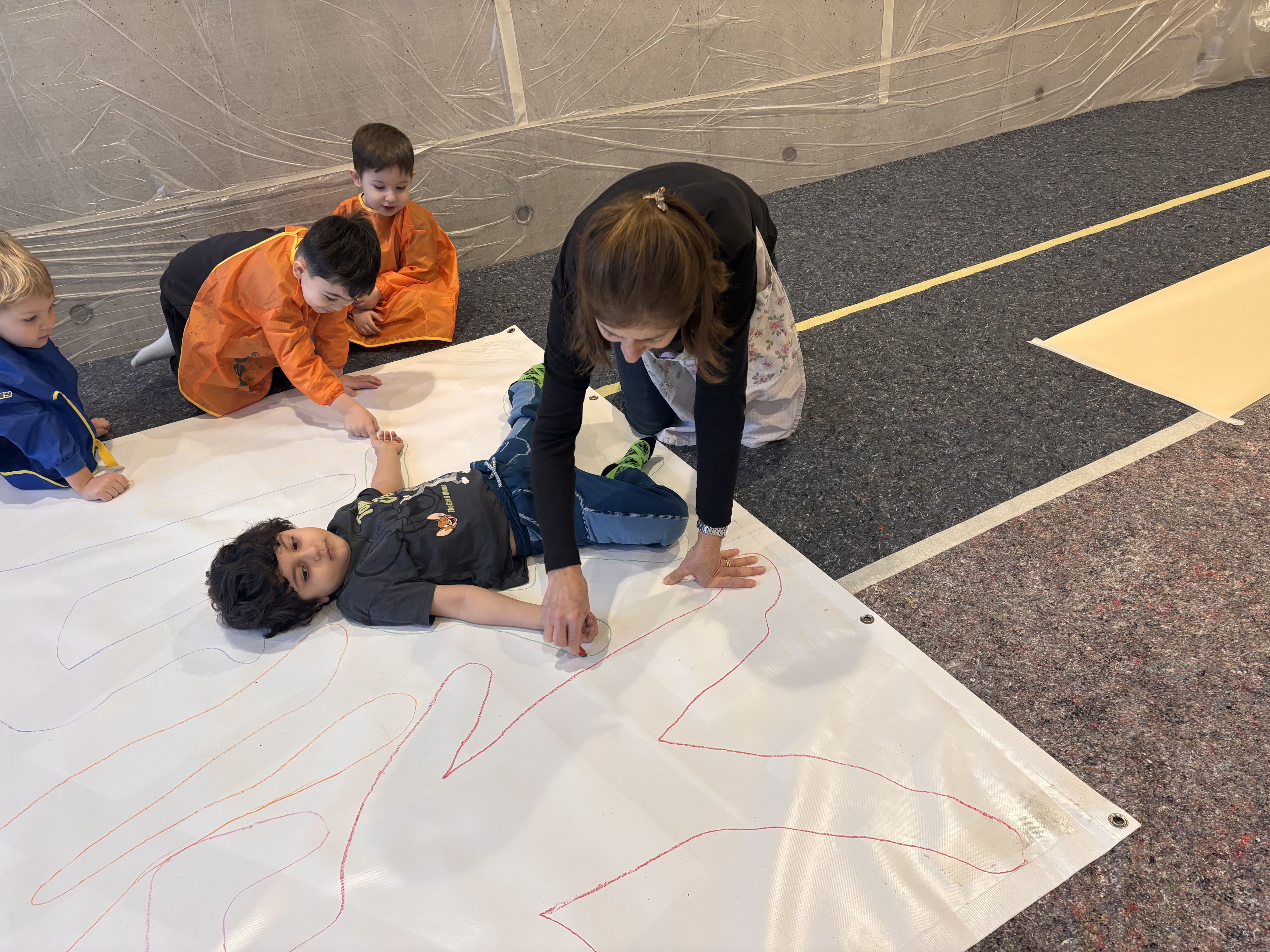 Zu Beginn tauchten die Kinder spielerisch in die Welt der Farben ein. Bei einem großen Gemeinschaftsbild wurden Körperumrisse nachgezeichnet, Farben geschleudert, mit Pipetten gemischt und in Bewegung aufgetragen. Die Kinder erlebten, wie sich Grundfarben verändern, wenn sie ineinanderfließen, und entdeckten dabei mit allen Sinnen die Wirkung von Rot, Blau und Gelb. Mit unterschiedlichen Materialien und Techniken entstanden erste eindrucksvolle Werke.