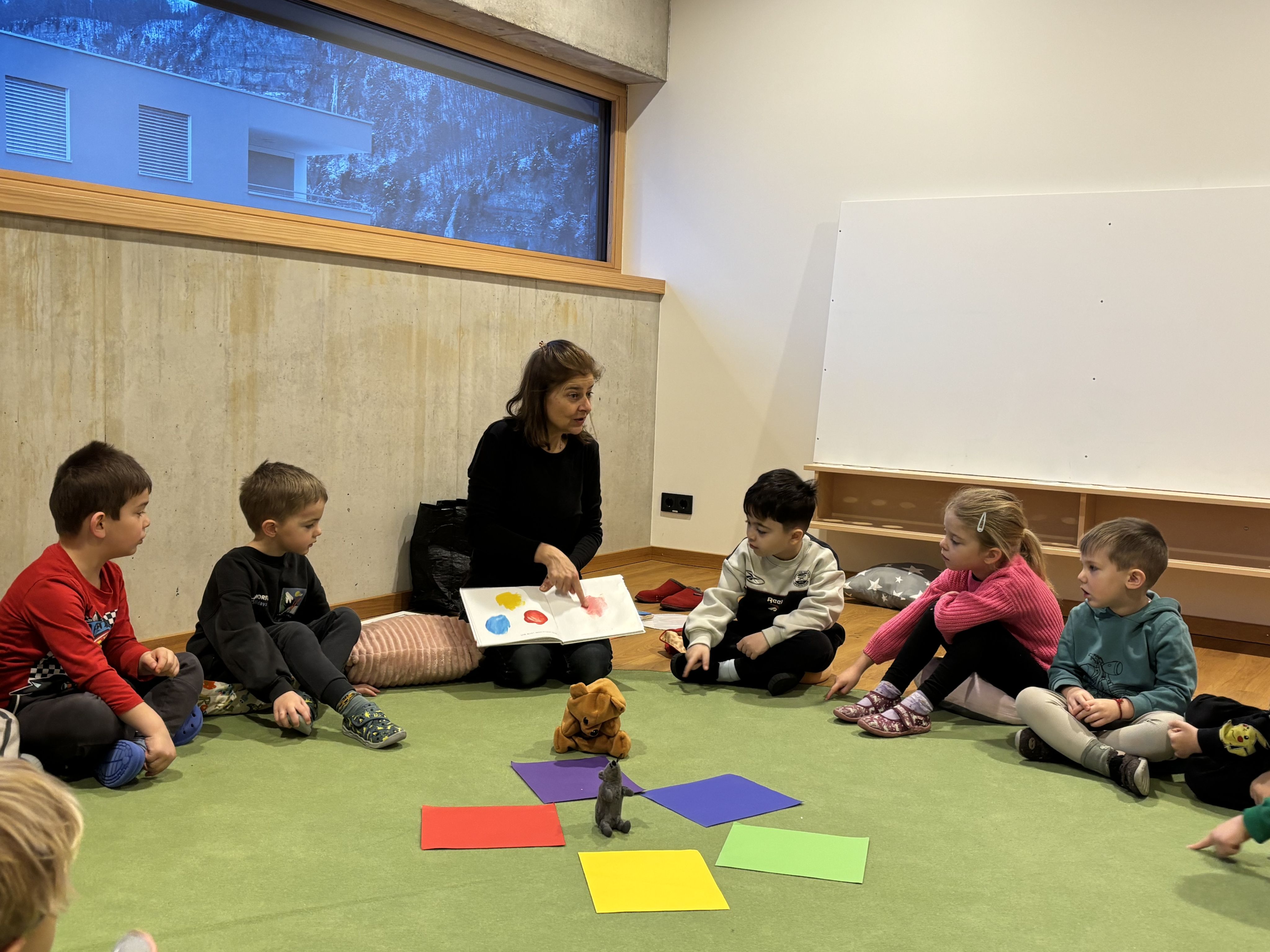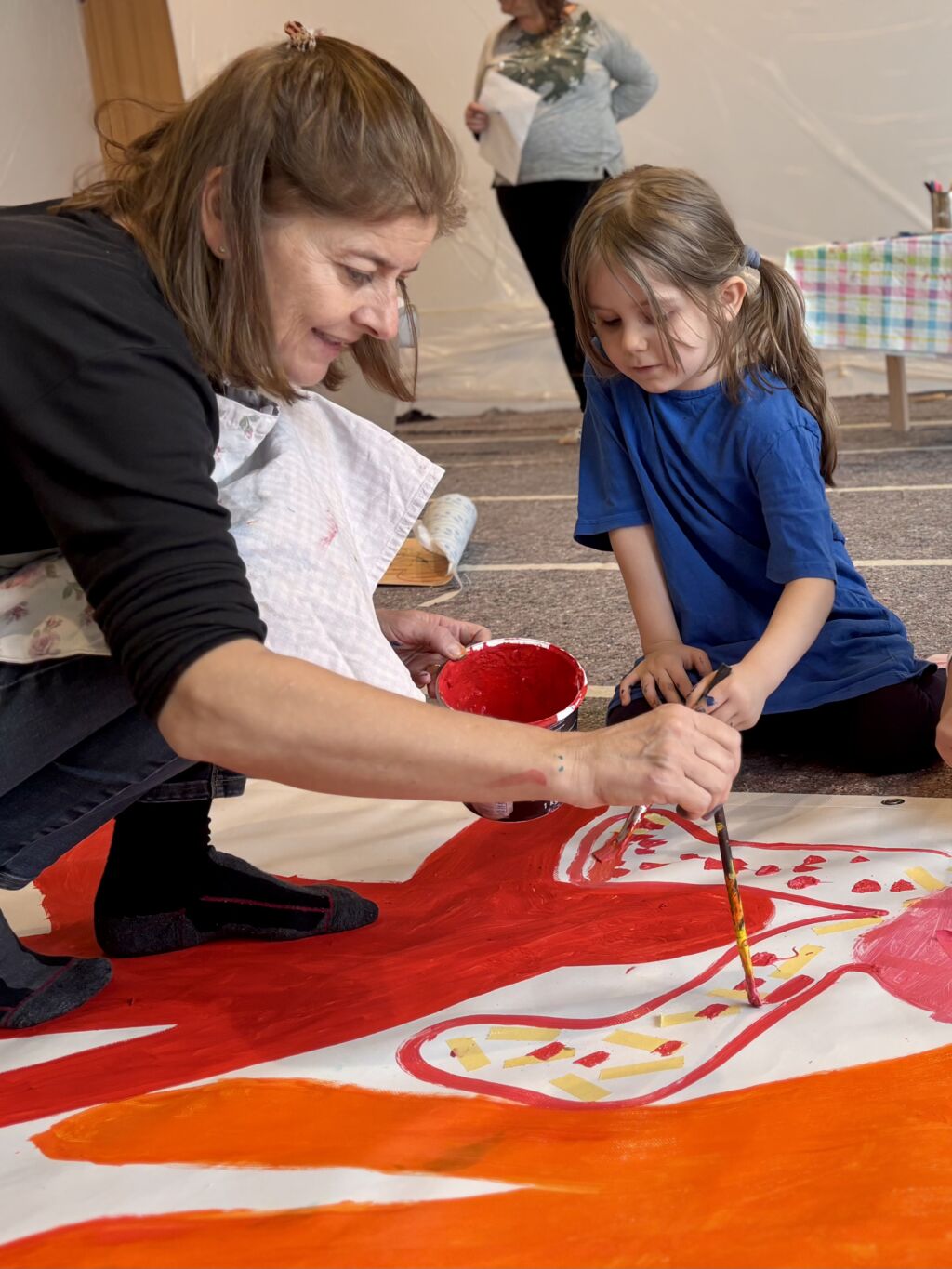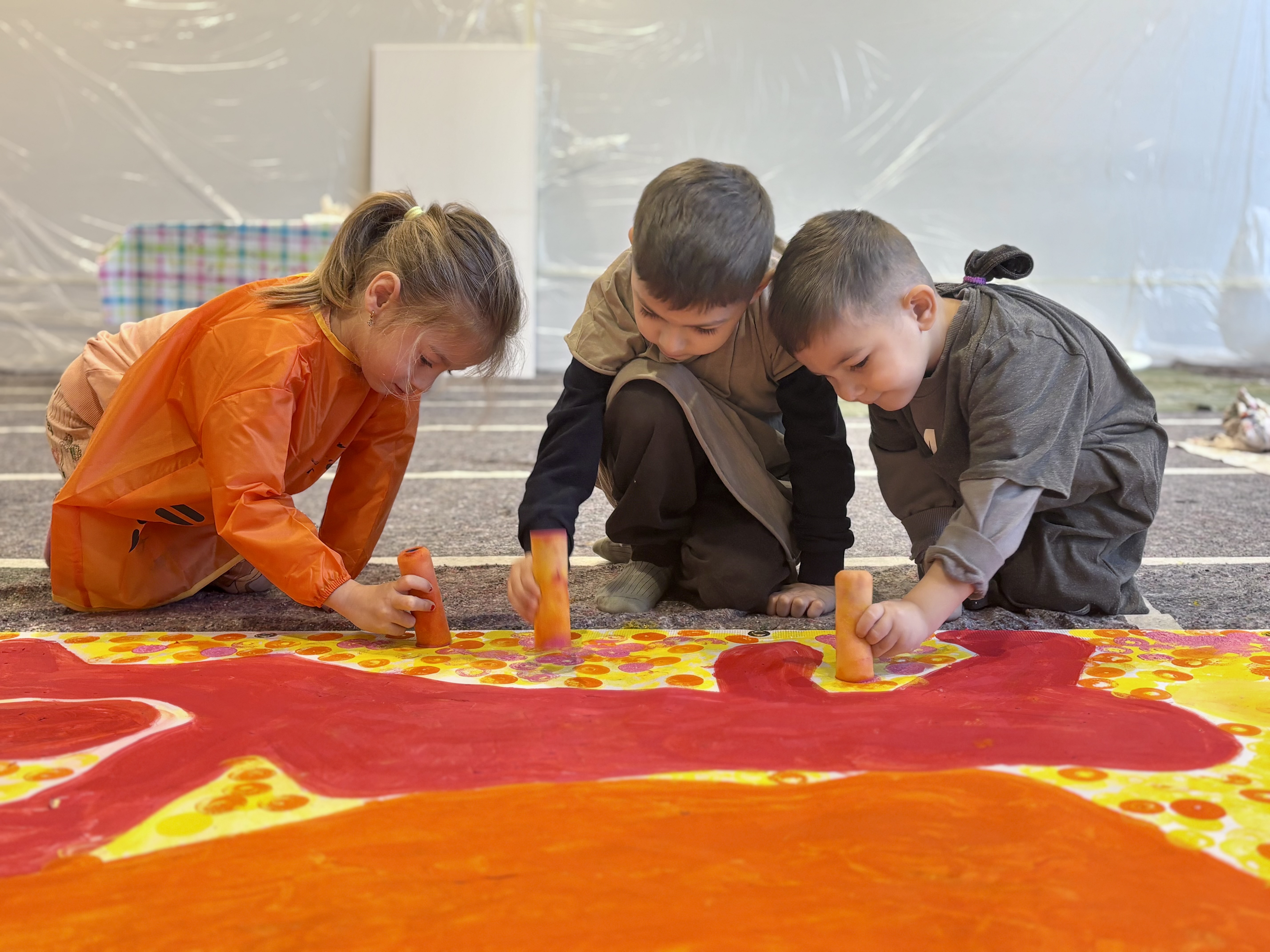 Zu Beginn tauchten die Kinder spielerisch in die Welt der Farben ein. Bei einem großen Gemeinschaftsbild wurden Körperumrisse nachgezeichnet, Farben geschleudert, mit Pipetten gemischt und in Bewegung aufgetragen. Die Kinder erlebten, wie sich Grundfarben verändern, wenn sie ineinanderfließen, und entdeckten dabei mit allen Sinnen die Wirkung von Rot, Blau und Gelb. Mit unterschiedlichen Materialien und Techniken entstanden erste eindrucksvolle Werke.