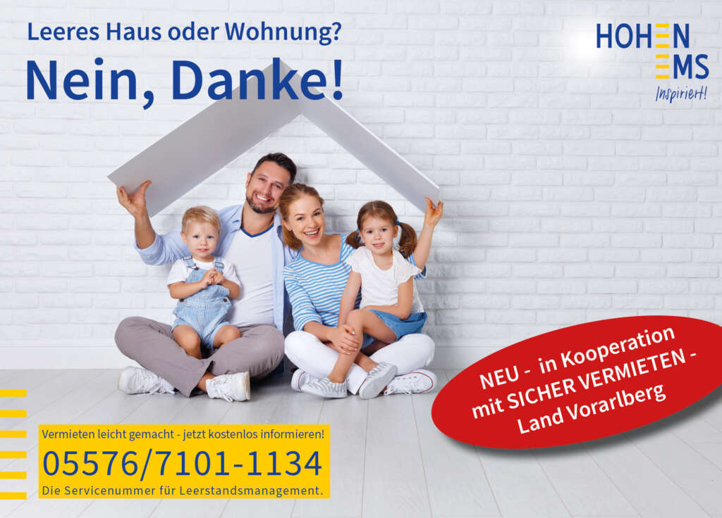 Falls Sie über ein geeignetes Objekt verfügen und dieses gerne vermieten möchten, unterstützen wir Sie gerne, geeignete Mieter zu Ihrer Immobilie zu finden (gemeinsame Wohnungsbesichtigung, „Sicher vermieten Vorarlberg“, Mietzins etc.).