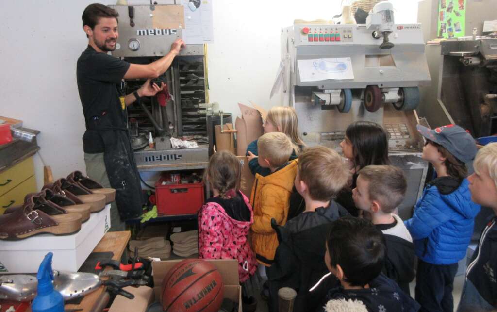 Die Kinder des Kindergartens Erlach besuchten am Mittwoch, dem 4. Oktober 2023, Laurin Salzgeber in seiner Orthopädie-Schuh-Werkstatt in der Schlossbergstraße.