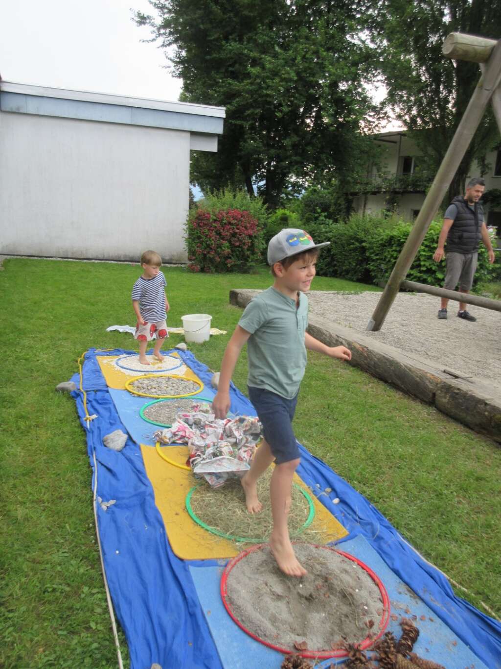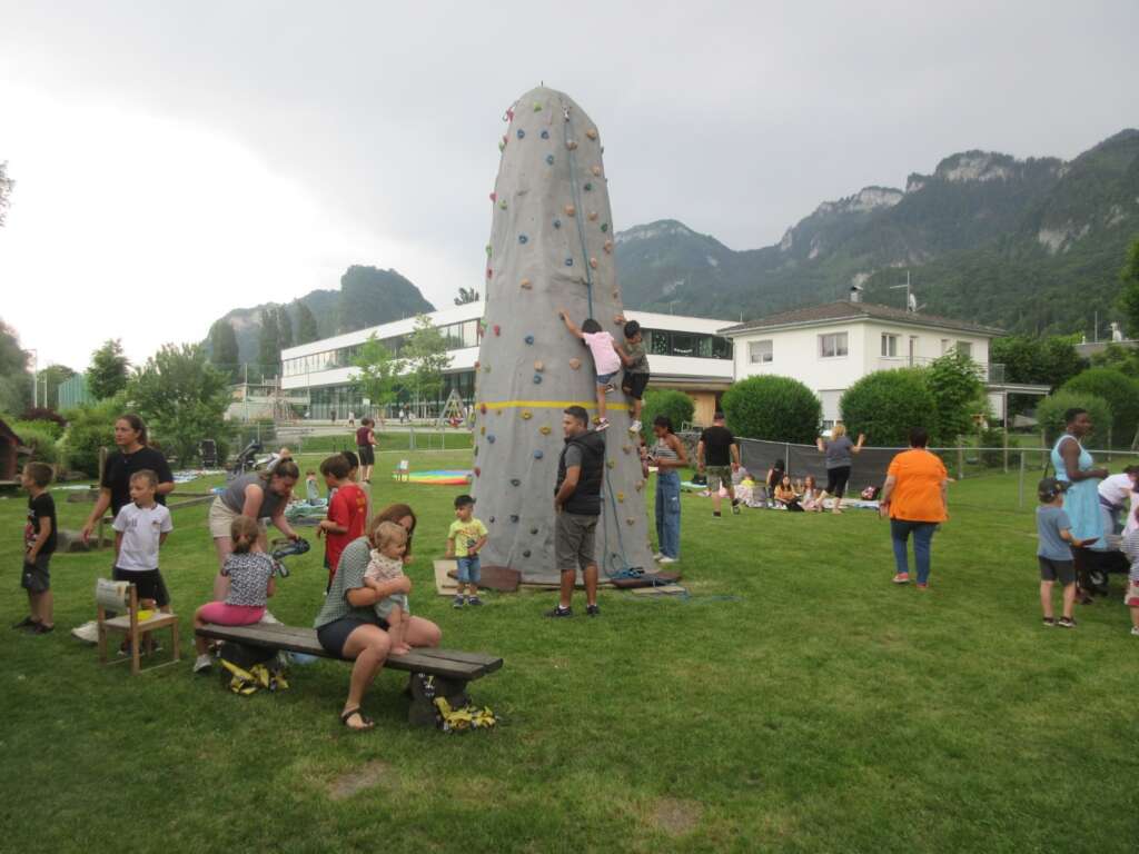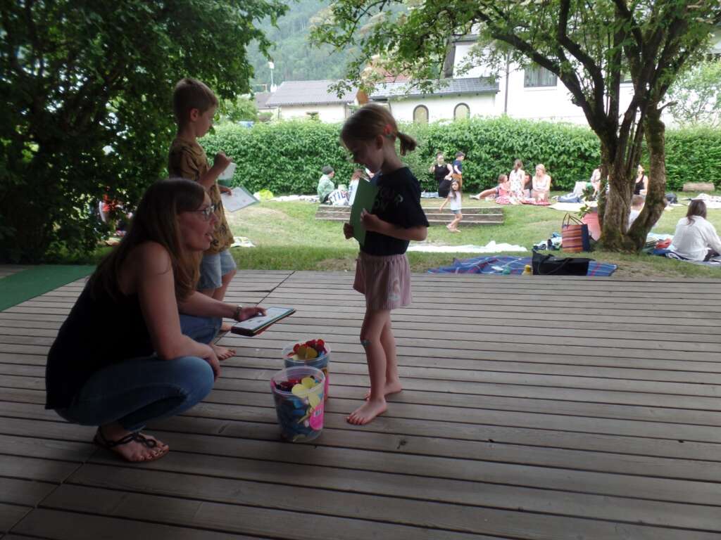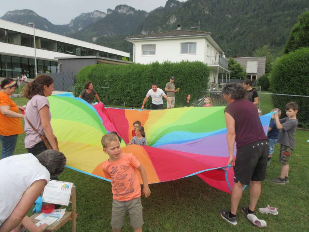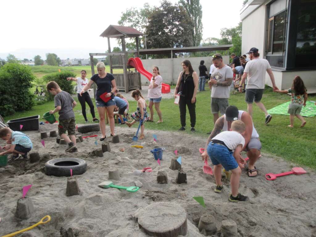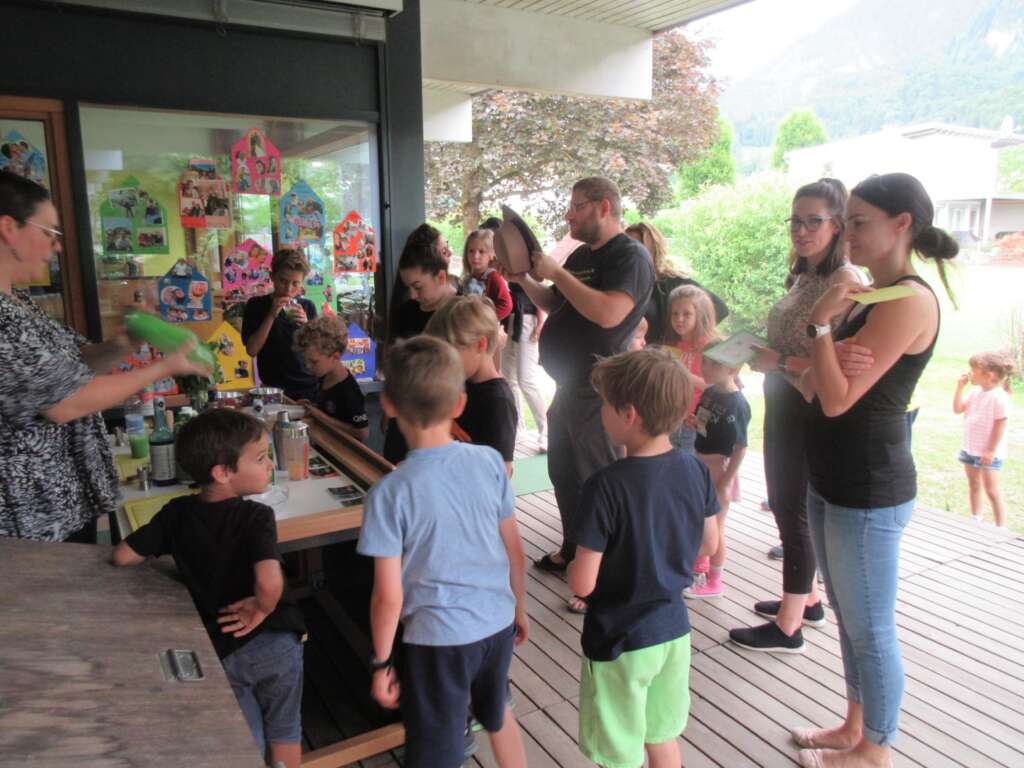 Im Garten wurden unterschiedlichste Stationen (z. B. Schwungtuch-Spiele, Kletterturm, Sandburgen bauen, Wasserspritzen, Sackhüpfen etc.) angeboten, welche die Familien mit einem Stempelpass erledigen konnten. Als Erfrischung zwischendurch gab es einen Cocktailstand, bei dem zwei fleißige Helfer (Felix und Samuel von der Bürgermusik Hohenems) uns beim Mixen der Getränke unterstützt haben.