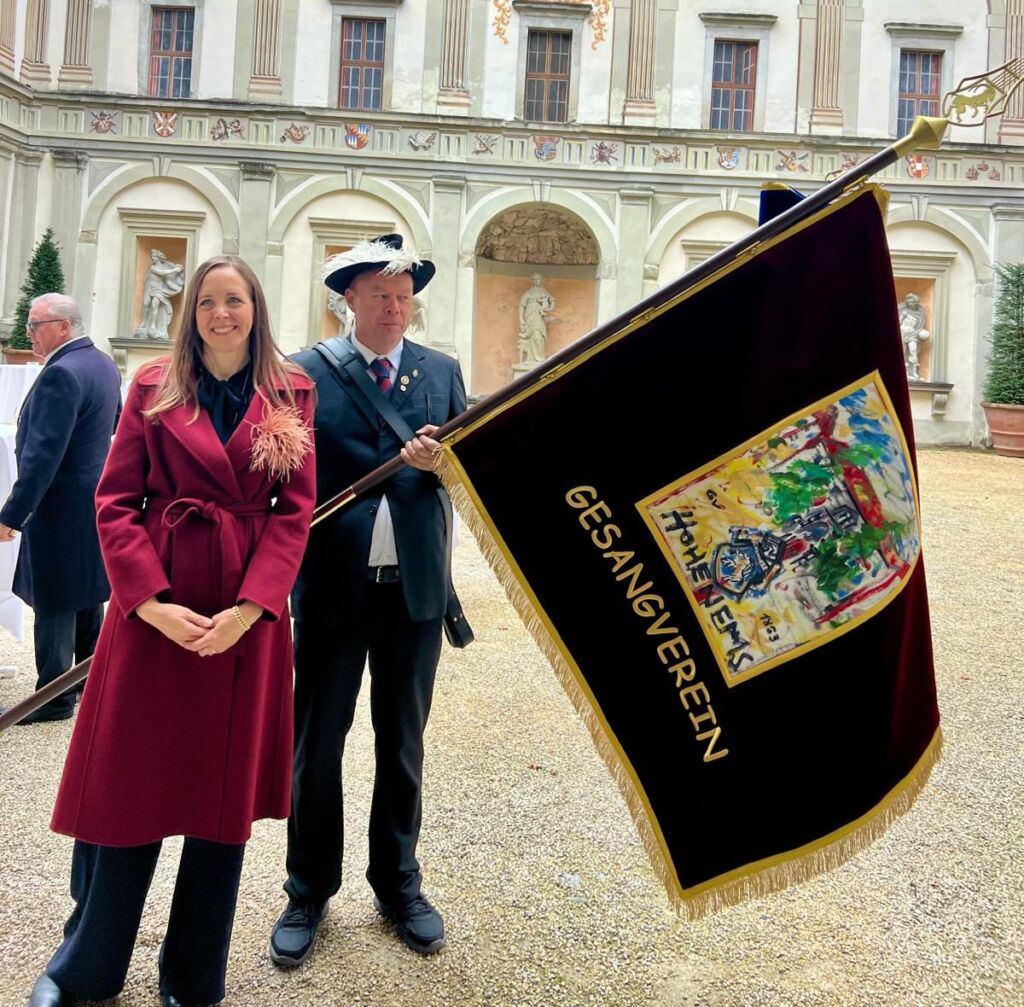 Nach dem gemeinsamen Auszug der Fahnen und Sänger begrüßte eine Abordnung der Bürgermusik Hohenems die Gäste mit ihren Ehrenklängen. Bei der anschließenden Agape im Palasthof nutzten die meisten Besucher die Gelegenheit, die neue Fahne aus nächster Nähe zu bewundern und miteinander ins Gespräch zu kommen.