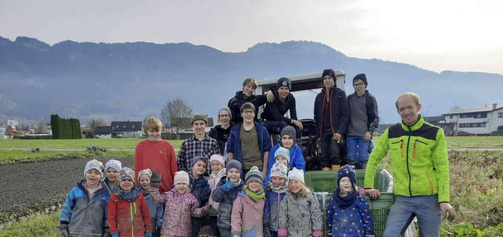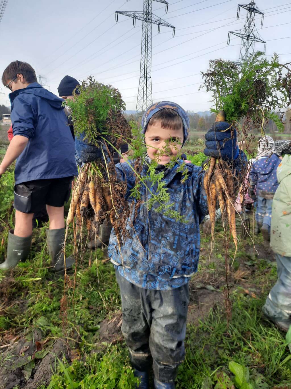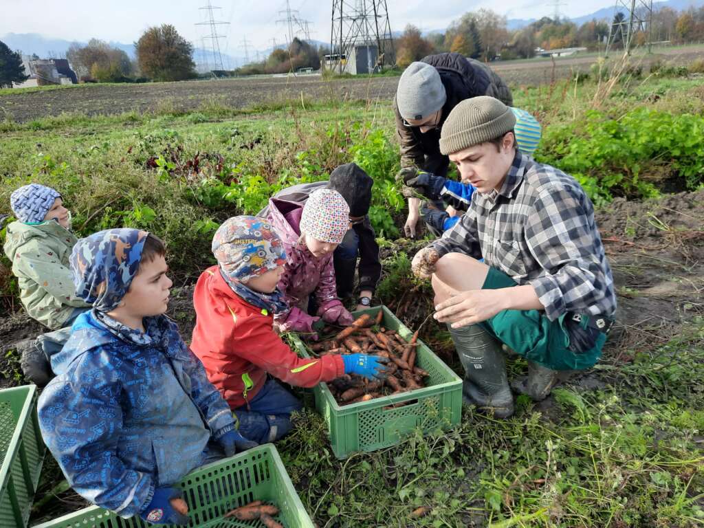 Am Freitag, dem 11. November 2022, durften die Hofküken mit den Schülern des BSBZ und ihrem Lehrer Christoph Weißenbach Karotten ernten.