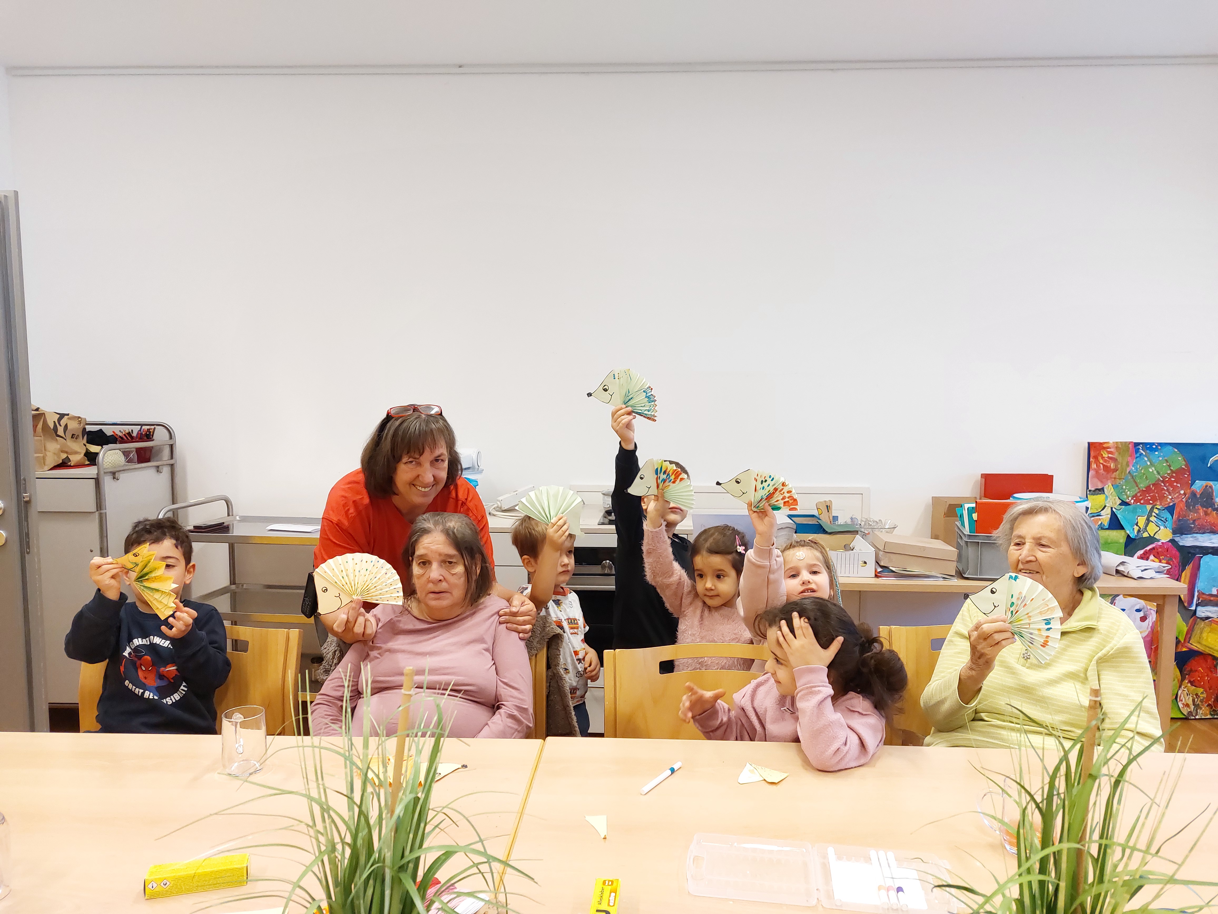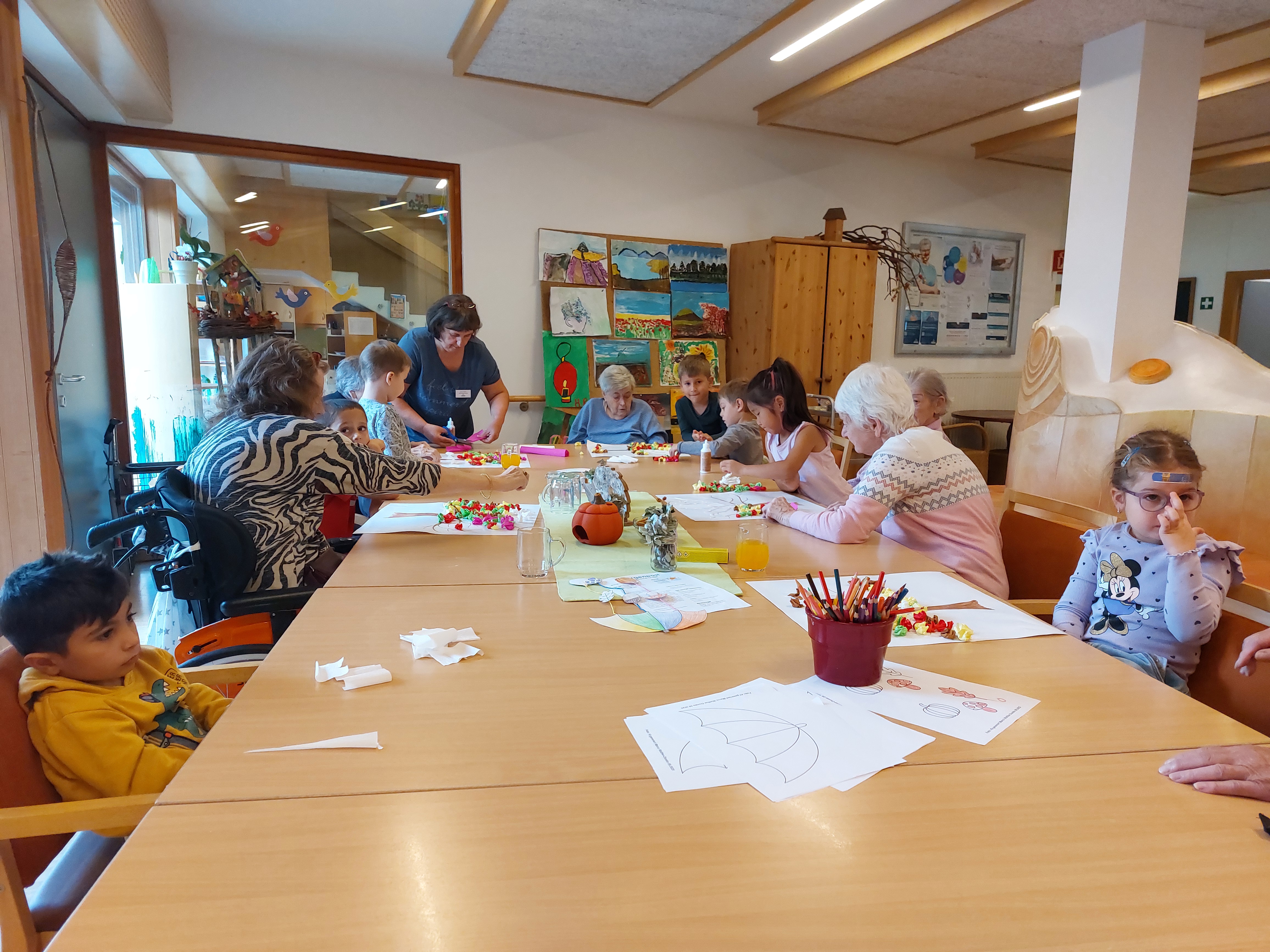 Heuer im Herbst haben wir uns mit einer Gruppe von Senioren im Eingangsbereich getroffen und gemeinsam mehrere Herbstbilder gestaltet. Dabei haben wir aus buntem Krepppapier Kugeln gerollt und auf einen Baum geklebt. Eine sehr einfache Tätigkeit, doch das Besondere war das Miteinander von Groß und Klein.