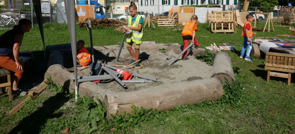 Besonders spannend war es, die Kinder dabei zuzusehen, wie sie Ziegelsteine richtig anordneten und das Wasser-Sand Gemisch als Mörtel nutzten, um stabile und sichere Wände zu errichten. Die jüngeren Kinder konnten sich im großen Sandkasten mit dem Verlegen von Wasserleitungen ausprobieren oder sich eine kleine Abkühlung gönnen. Kreativität wurde hierbei großgeschrieben und mit Rohren unterirdische Tunnel gebaut.