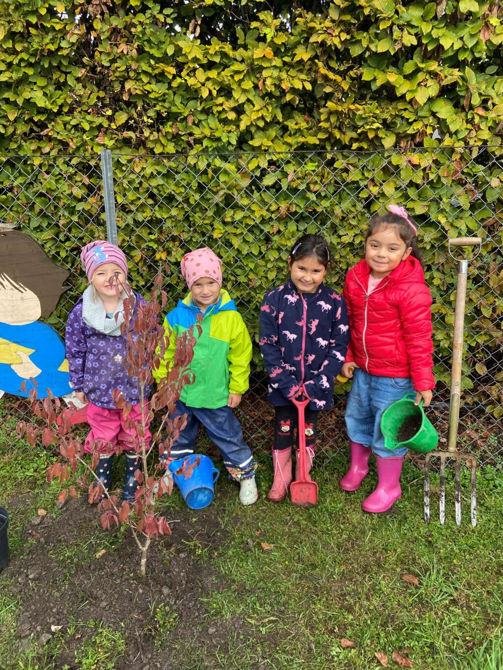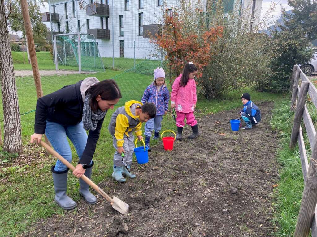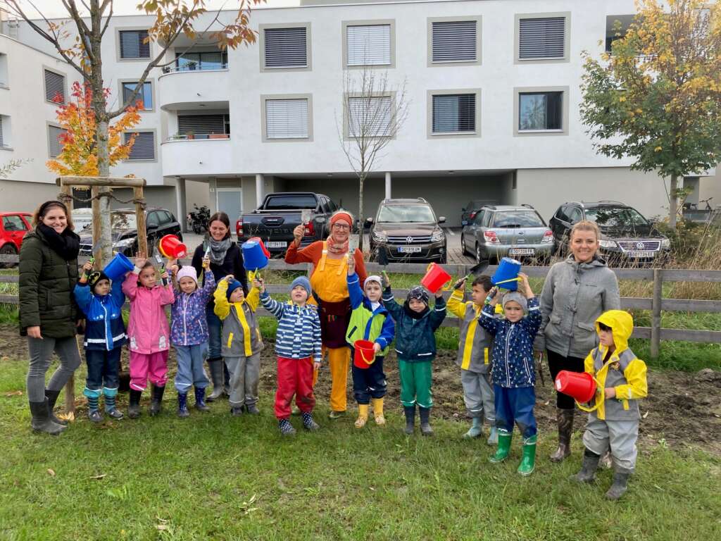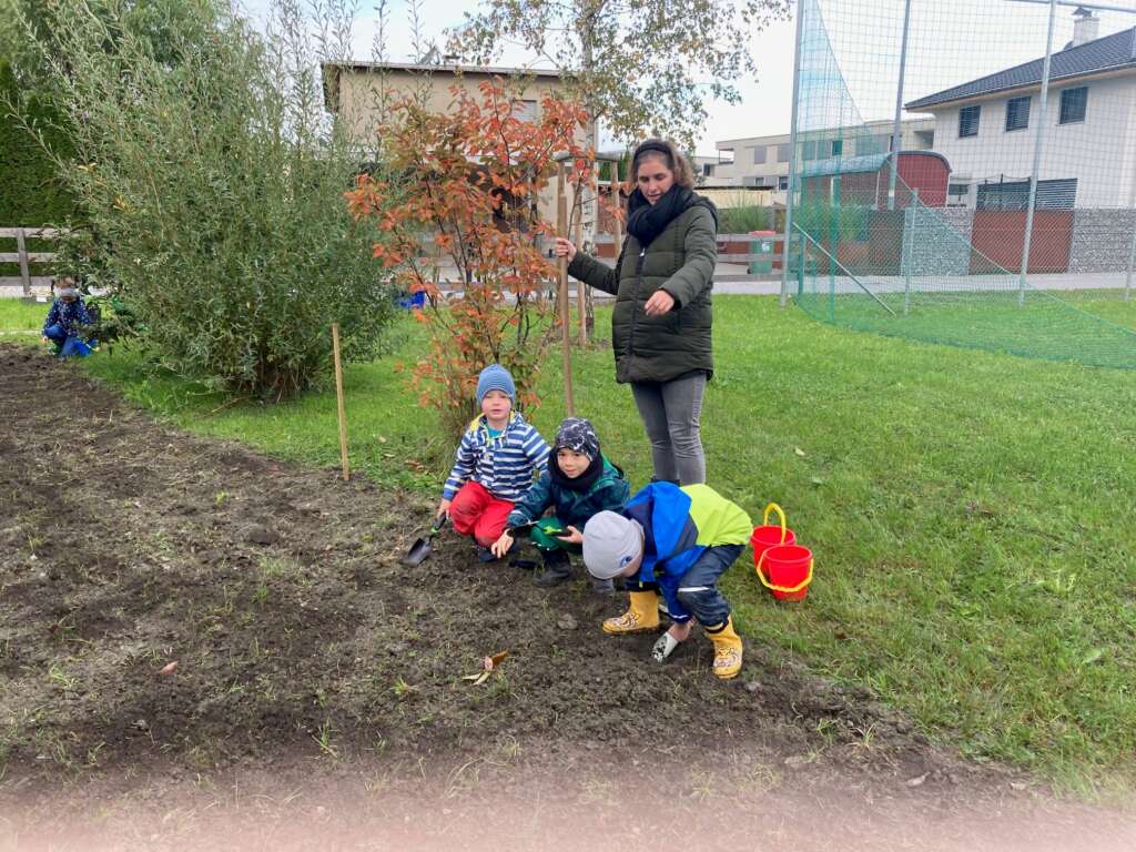 Am Spielgelände des Kindergarten Markts mussten die Kinder mit aller Kraft graben, denn es kamen viele Steine zum Vorschein. Gesetzt wurde eine Weide und ein Kornelkirschenstrauch, heimische Blumen wie Glockenblumen, Malven, Königskerze und wilder Oregano wurden gesät und für die erste Blüte im Frühling Wildtulpen, Krokusse und Traubenhyazinthen in den Boden vergraben.
