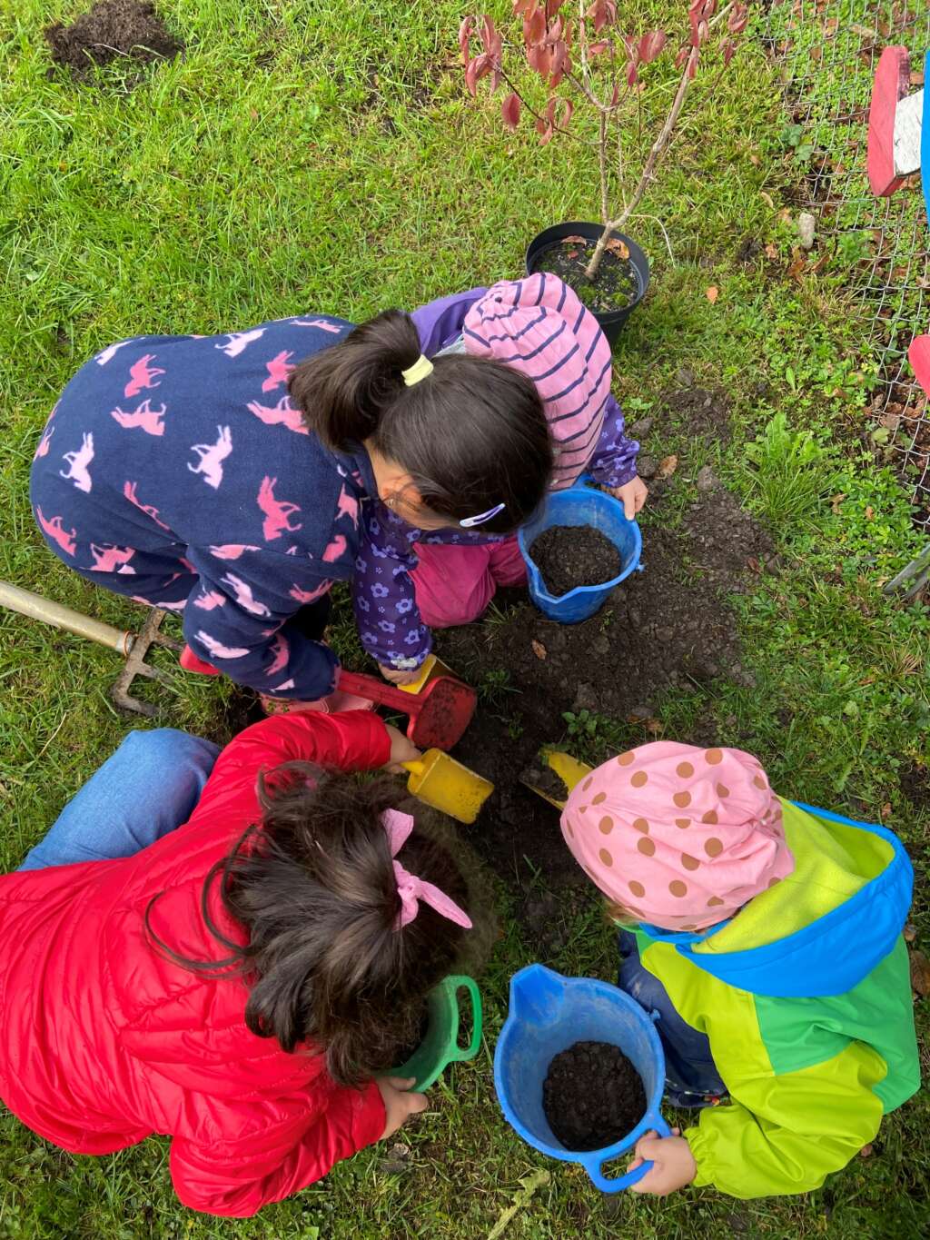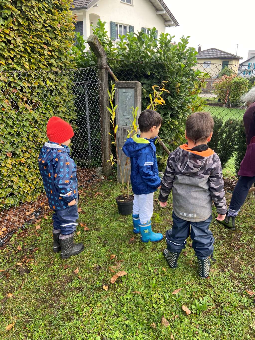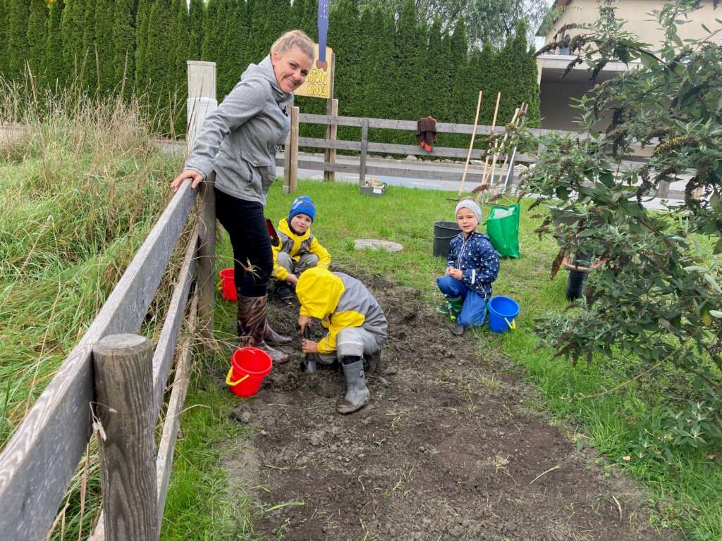 Am Spielgelände des Kindergarten Markts mussten die Kinder mit aller Kraft graben, denn es kamen viele Steine zum Vorschein. Gesetzt wurde eine Weide und ein Kornelkirschenstrauch, heimische Blumen wie Glockenblumen, Malven, Königskerze und wilder Oregano wurden gesät und für die erste Blüte im Frühling Wildtulpen, Krokusse und Traubenhyazinthen in den Boden vergraben.