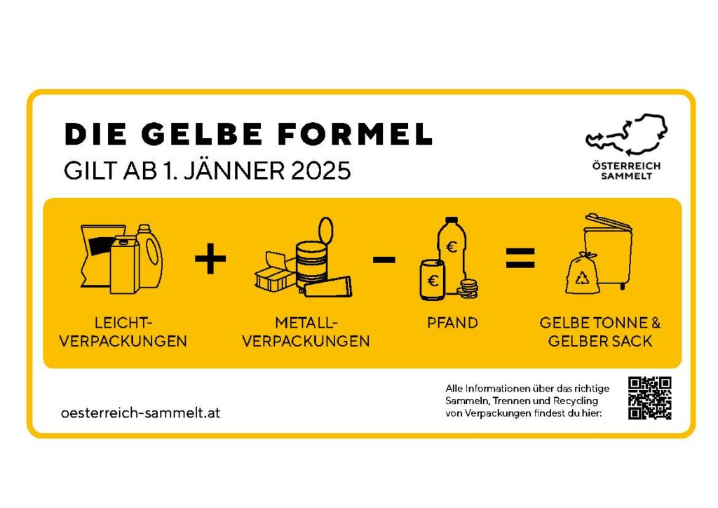 Leichtverpackungen aus Kunststoff wie Joghurtbecher, Getränkeverbundkartons, Folienverpackungen, Verpackungen von Käse- und Wurstwaren sowie Wasch- und Putzmittelflaschen werden auch 2025 unverändert im Gelben Sack entsorgt. Ab 1. Jänner 2025 müssen zusätzlich auch Metall-Verpackungen im Gelben Sack entsorgt werden, zum Beispiel Konservendosen, Kronkorken, Thunfisch- und Tierfutterdosen.