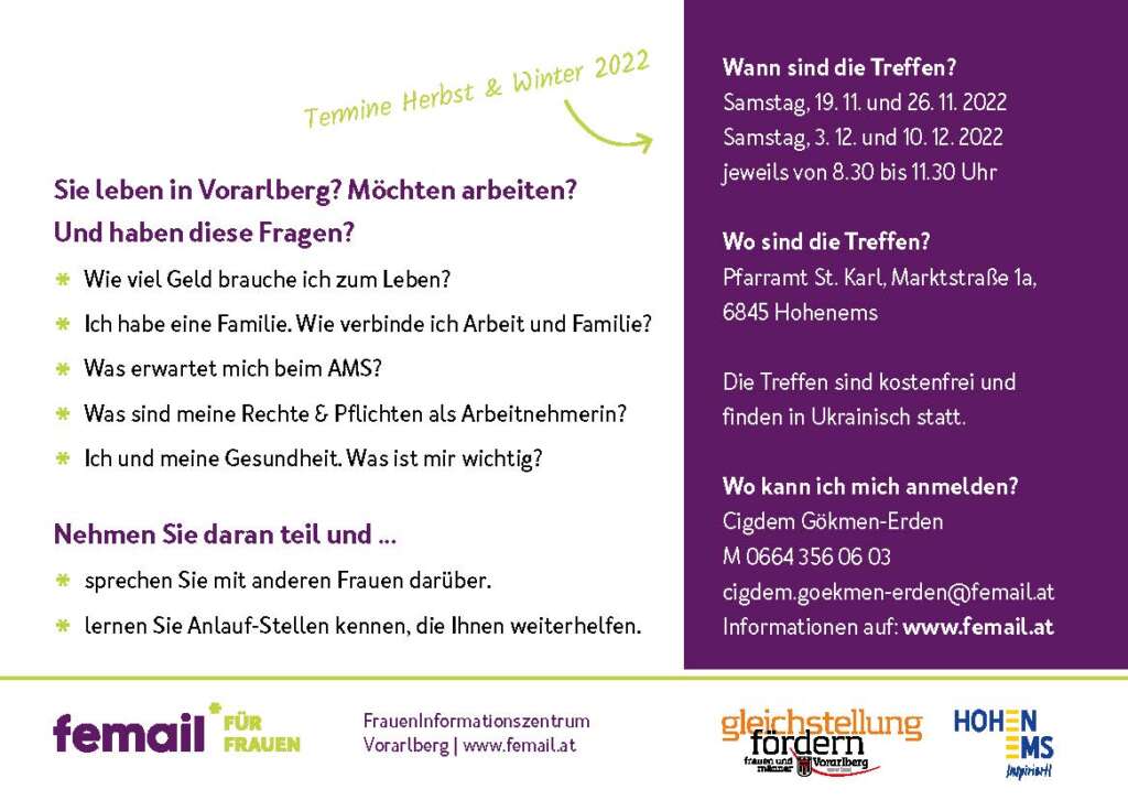 Seit Samstag, dem 19. November 2022, findet eine Workshop-Reihe zum Thema „Leben und Arbeiten in Vorarlberg …“ – ein Kooperationsprojekt von femail, Land Vorarlberg und Stadt Hohenems – für Frauen aus der Ukraine statt.