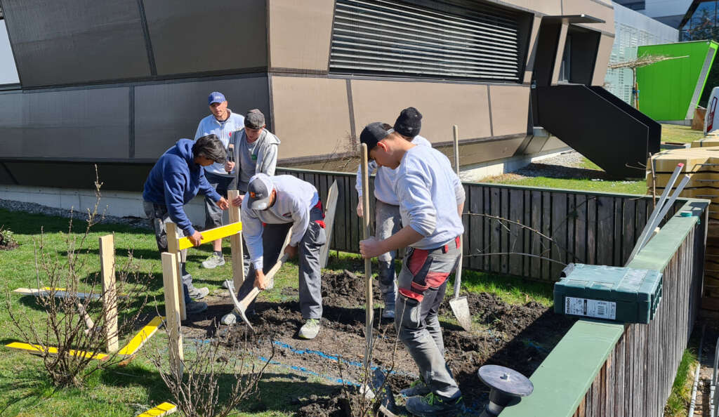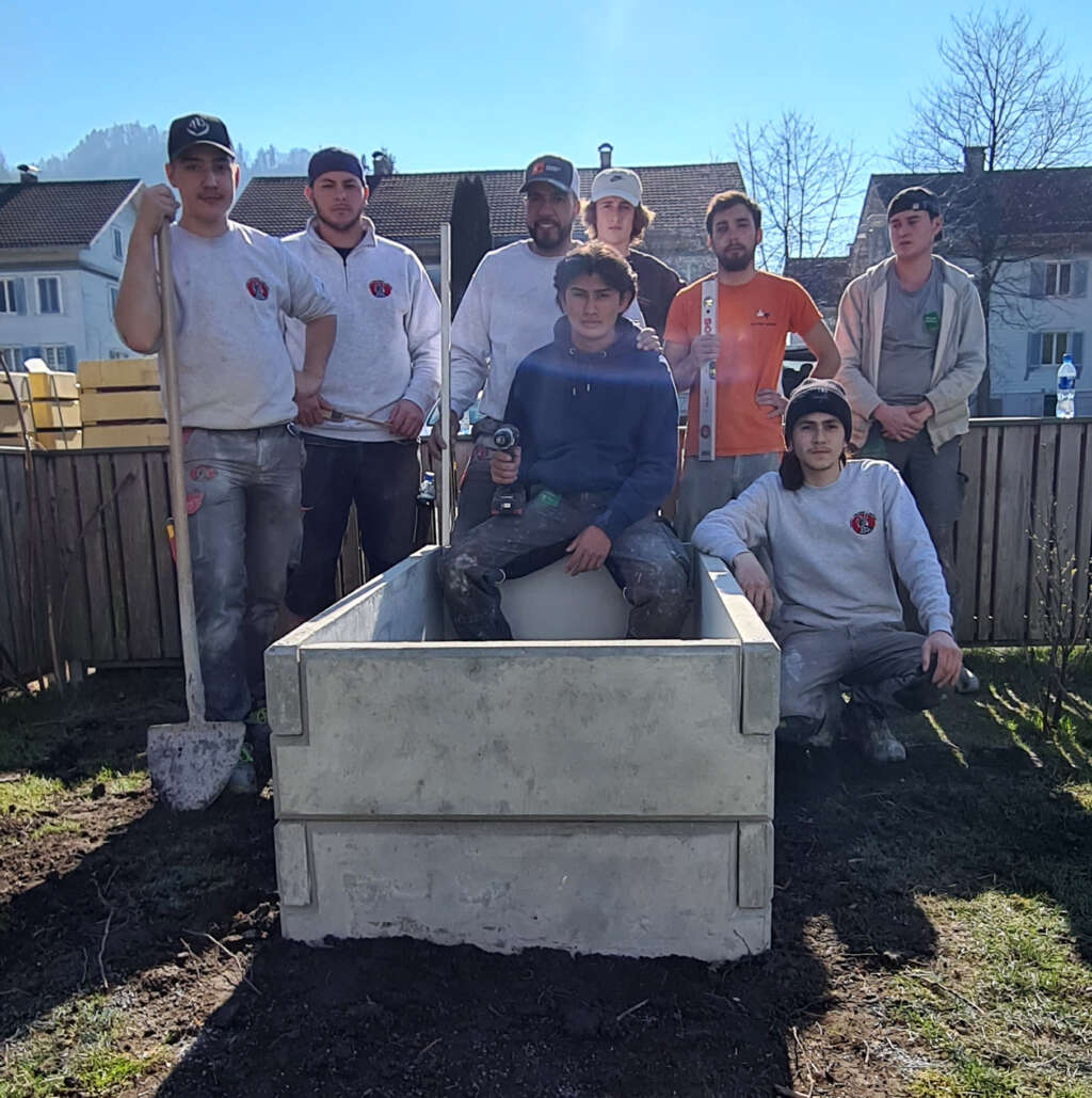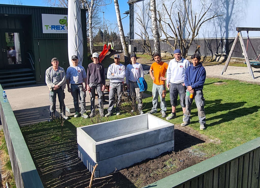 Im Rahmen eines Lehrlingsprojekts des Maurer Ausbildungszentrums, das im Hohenemser WIFI angesiedelt ist, bauten acht Lehrlinge gemeinsam mit Projektleiter Stefan Moosbrugger ein Hochbeet für die Kinderbetreuung T-Rex bei der Firma Tectum.