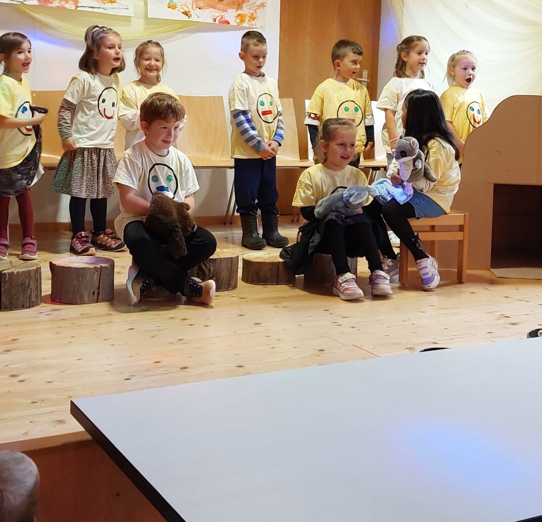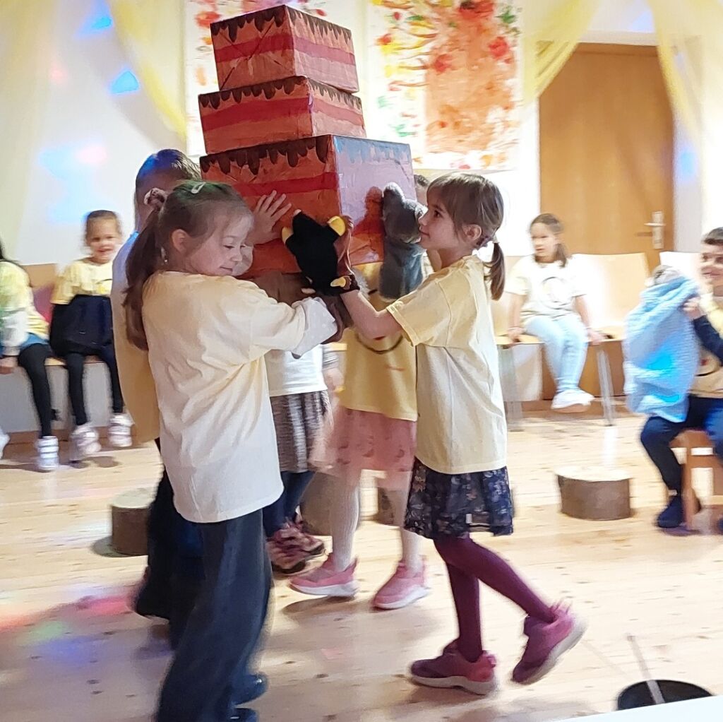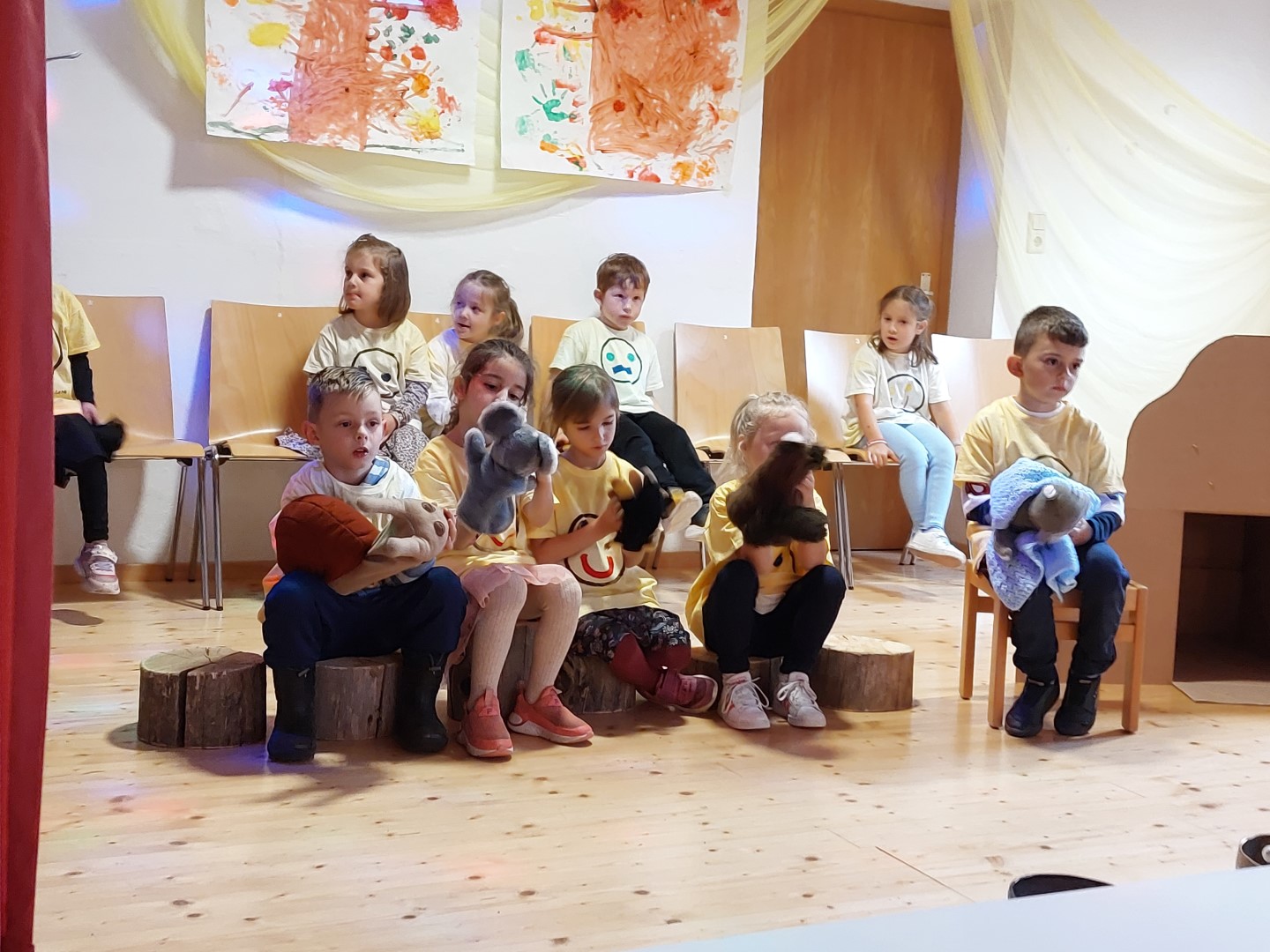 Im Saal des Arbeitervereinsheims führten die Kinder ein Musiktheaterstück, frei nach dem Bilderbuch des „Kleinen Siebenschläfers“, auf. Eingeladen waren Eltern, Großeltern, Geschwister und Freunde. Mit Hilfe von Handpuppen schlüpften die Kinder in ihre Rolle und brachten das Publikum zum Staunen.