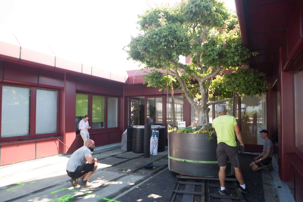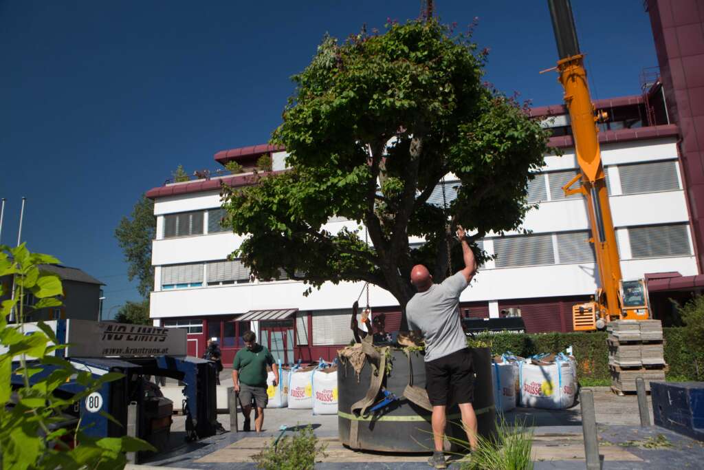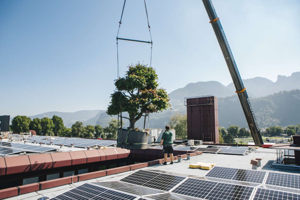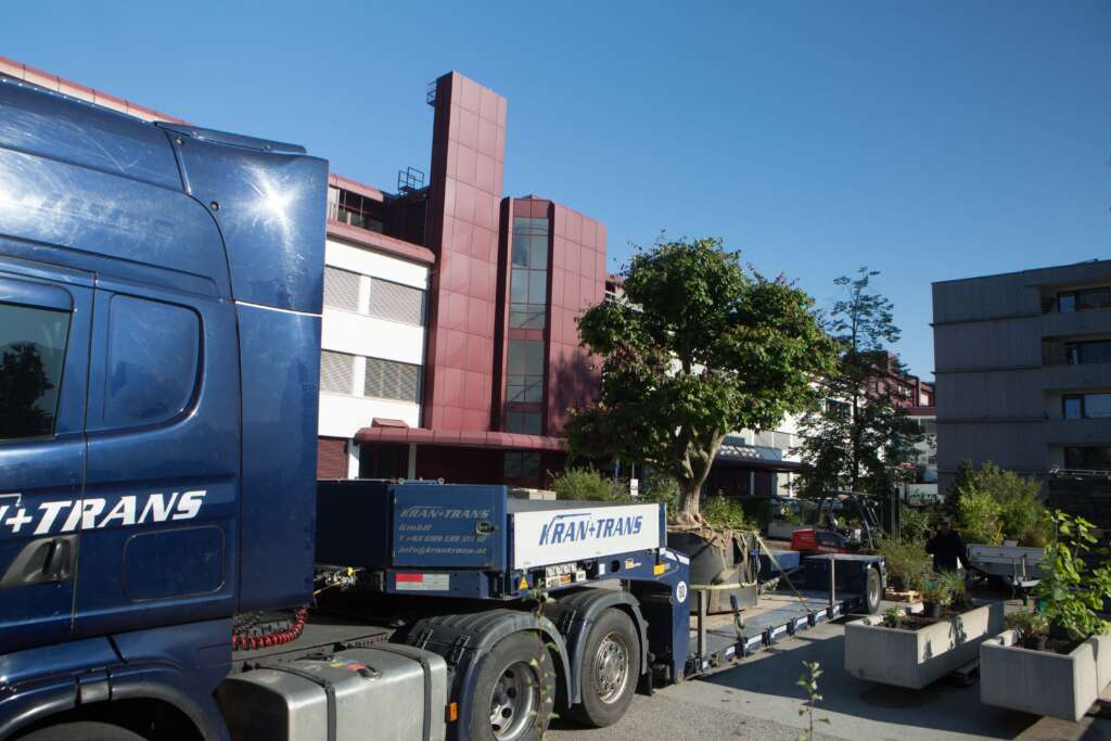 Dieser ziert nun eine der beiden Dachterrassen im dritten Obergeschoß auf dem Bäumler-Park, wo auf rund 130 Quadratmetern Naturflächen angelegt werden. Der 40-jährige Eisenholzbaum hat eine Größe von rund sechs Metern und ist Mittelpunkt der neuen „Kunstterrasse“. Am vergangenen Donnerstag hievte ein Schwerkran den „Koloss“ auf die Dachterrasse. Dort findet sich auch eine Spiegel-Skulptur von Miriam Prantl, in welcher sich die Natur des Dachgartens widerspiegeln soll, umrahmt von Natur.