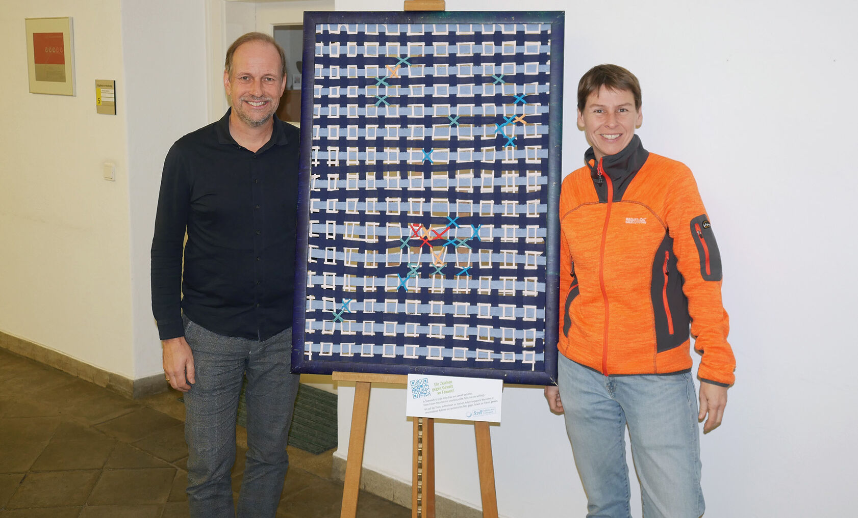 Bürgermeister Dieter Egger und Vize-Bürgermeisterin Patricia Tschallener spinnen ein gemeinsames Netz, wo Gewalt gegen Frauen keinen Platz findet.