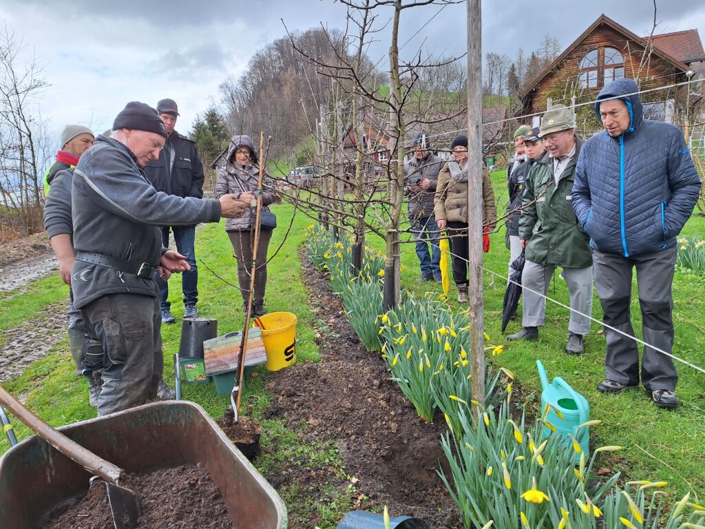 Im Zusammenhang mit der Baumpflanzaktion der Stadt konnten die heurigen, baldigen Obstbaumbesitzer aus dieser Aktion beim Obmann des OGV Emsreute Hermann Klien miterleben, wie ein Obstbaum richtig gepflanzt wird.