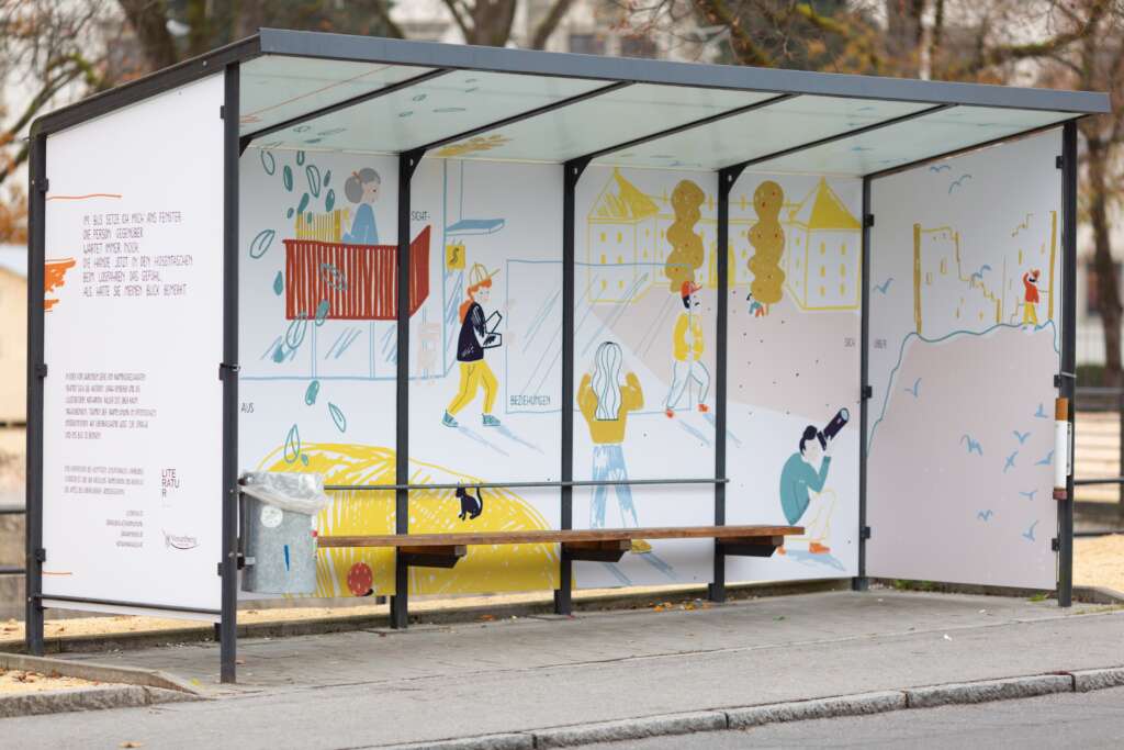 Über ein Jahr lang verwandelte sich die Bushaltestelle in eine begehbare „Graphic Novel“ (Bezeichnung für literarische Illustrationen, auch Comics). Die Geschichten für die Bushaltestelle wurden von der Autorin Sarah Rinderer geschrieben, für die grafische Umsetzung war die Illustratorin Katharina Ralser verantwortlich. Sie gingen dabei intensiv auf aktuelle Themen der Stadtentwicklung in Hohenems ein.