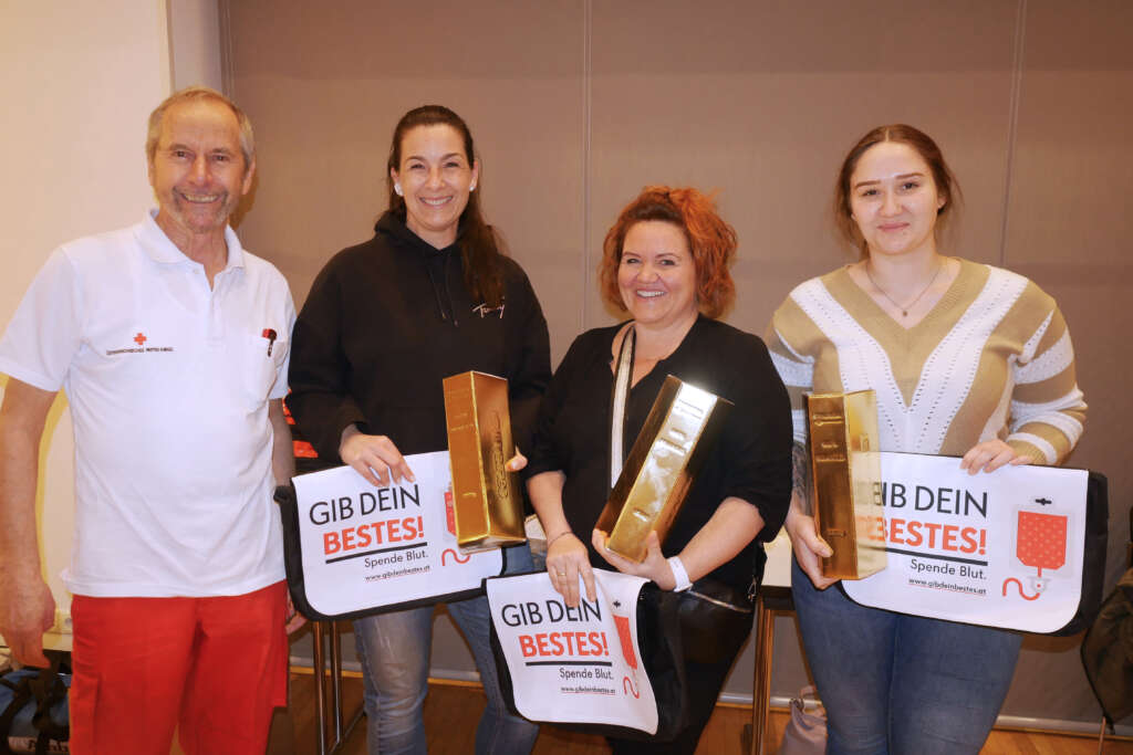 Je eine Flasche Sekt und eine Autoapotheke als kleine Anerkennung fürs Blutspenden überreichten Ehrenkommandant Norbert Rücker und Toni Amann als Vertreter der Hohenemser Rettungsabteilung an Julia Kertel als 99., Sonja Keck als 100., beide aus Hohenems, und Ruth Schuler-Maier aus Altach als 101. Spenderin.