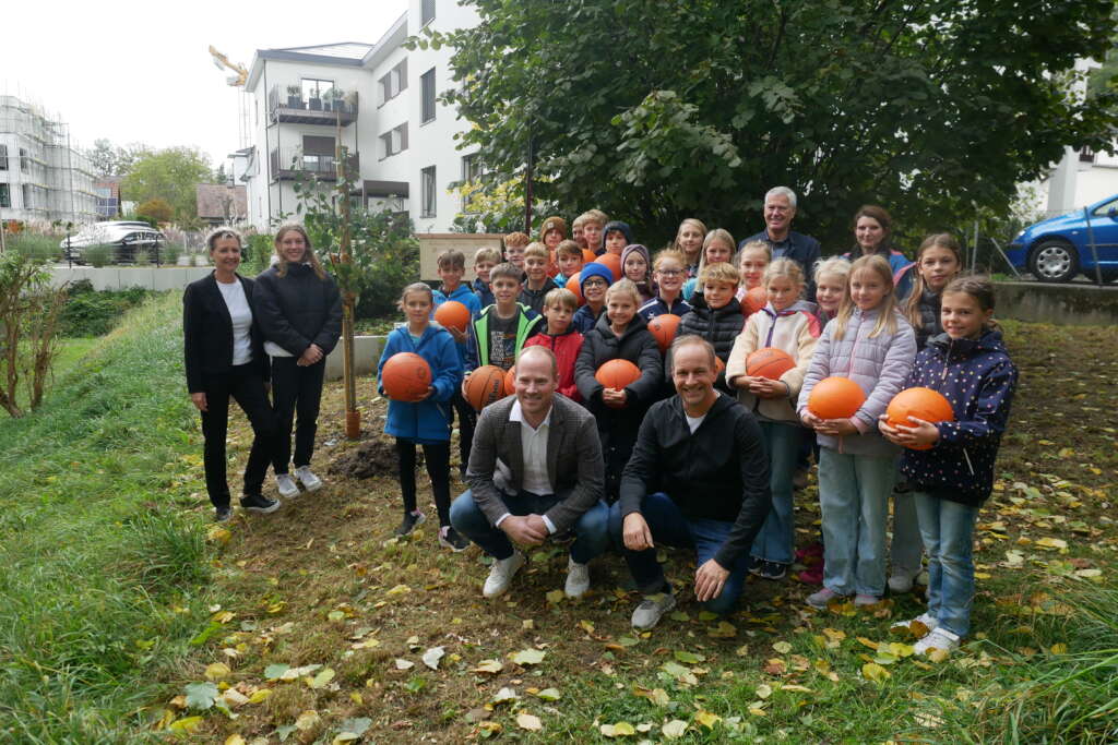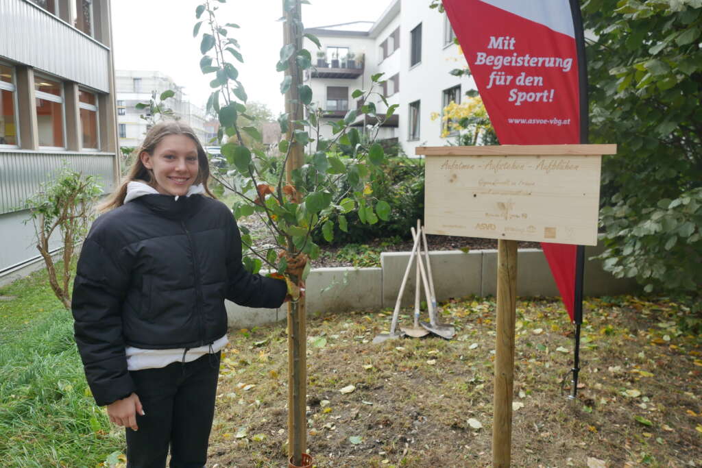 In Hohenems haben Bürgermeister Dieter Egger, ASVÖ-Geschäftsführer Clemens Fiel, die WM-Teilnehmerin Leni Bohle (Kunstturnerin aus Hohenems) und Schulleiterin Renate Moosmann zusammen mit der Schulklasse 1a und ihrer Klassenvorständin Jutta Jank einen Baum im Schulgarten der Sport-Mittelschule Markt gepflanzt.