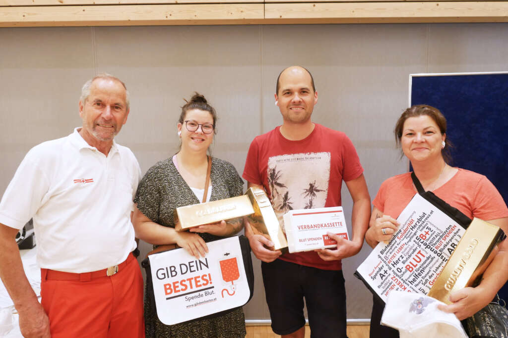 Auffallend bei dieser Blutspendeaktion in Hohenems war, dass sich diesmal neben den „Stammkunden“ auch wieder viele Jugendliche an der Aktion beteiligten. Stark vertreten – wie jedes Jahr – waren die Mitglieder der Freiwilligen Feuerwehr, des Lauftreffs und des VfB sowie des Vereins ATIB. Ebenso waren auch sehr viele Spender mit migrantischem Hintergrund und Erstspender vertreten. Je eine Flasche Sekt und eine Autoapotheke bzw. Umhängetasche als kleine Anerkennung fürs Blutspenden überreichten Ehrenkommandant Norbert Rücker und Toni Amann als Vertreter der Hohenemser Rettungsabteilung an Stefanie Breuß aus Mäder als 149., Pascal König aus Hohenems als 150. und Brigitte Breuß aus Koblach als 151. Spenderin.