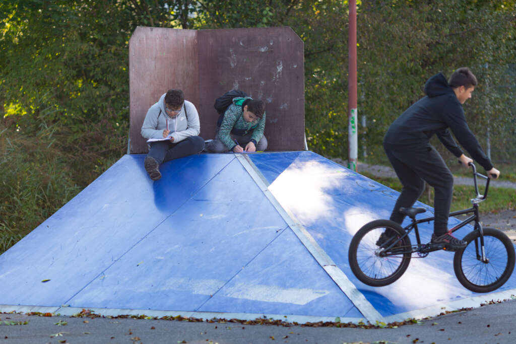Noel Staffler (14) erinnert sich besonders gern an das Schreiben auf dem Skaterplatz: „Das ist der Platz, den ich besonders cool finde, weil es mein Lieblingsplatz ist. Wir haben da mit Amos Postner Elfchen, also Gedichte aus elf Wörtern, geschrieben. Sonst mache ich da immer Tricks mit dem Skateboard und meistens treffe ich auch meine Freunde dort. Wenn ich mich auf dem Skaterplatz zwischen Tricks und dem Schreiben entscheiden müsste, würde ich zwar immer noch die Tricks wählen – aber das Schreiben war trotzdem voll cool. Ehrlich!“