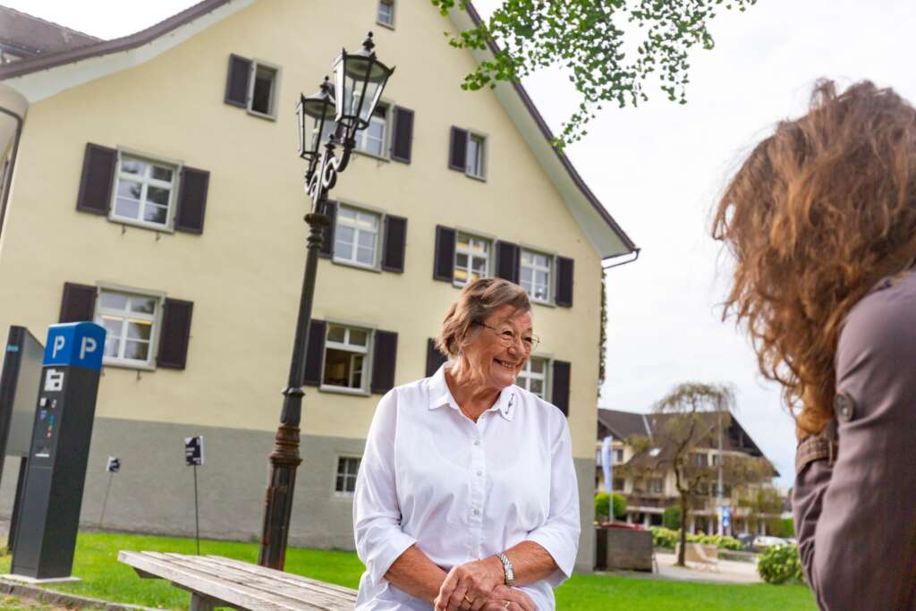 Hannelore König verbrachte ihre Kindheit im heutigen Rathaus und berichtet beim Stadtflüstern, wie sie als Dreijährige von ihren Brüdern im Korb am Türmle des Rathauses hochgezogen wurde.