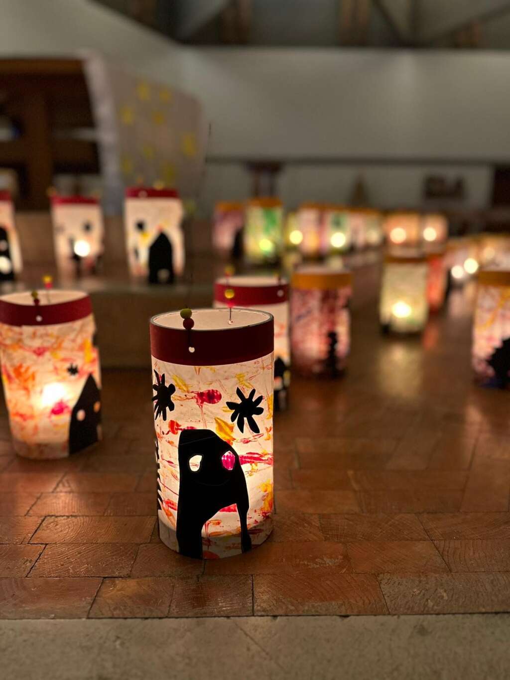 Aufgrund des Wetters war ein Laternenumzug durch die Straßen leider nicht möglich. Deshalb durften die Kinder mit ihren Laternen den Mittelgang der Kirche erleuchten. Anschließend zogen wir dann in den Gemeindesaal, um dort die Feier bei Kinderpunsch und Glühwein ausklingen zu lassen.