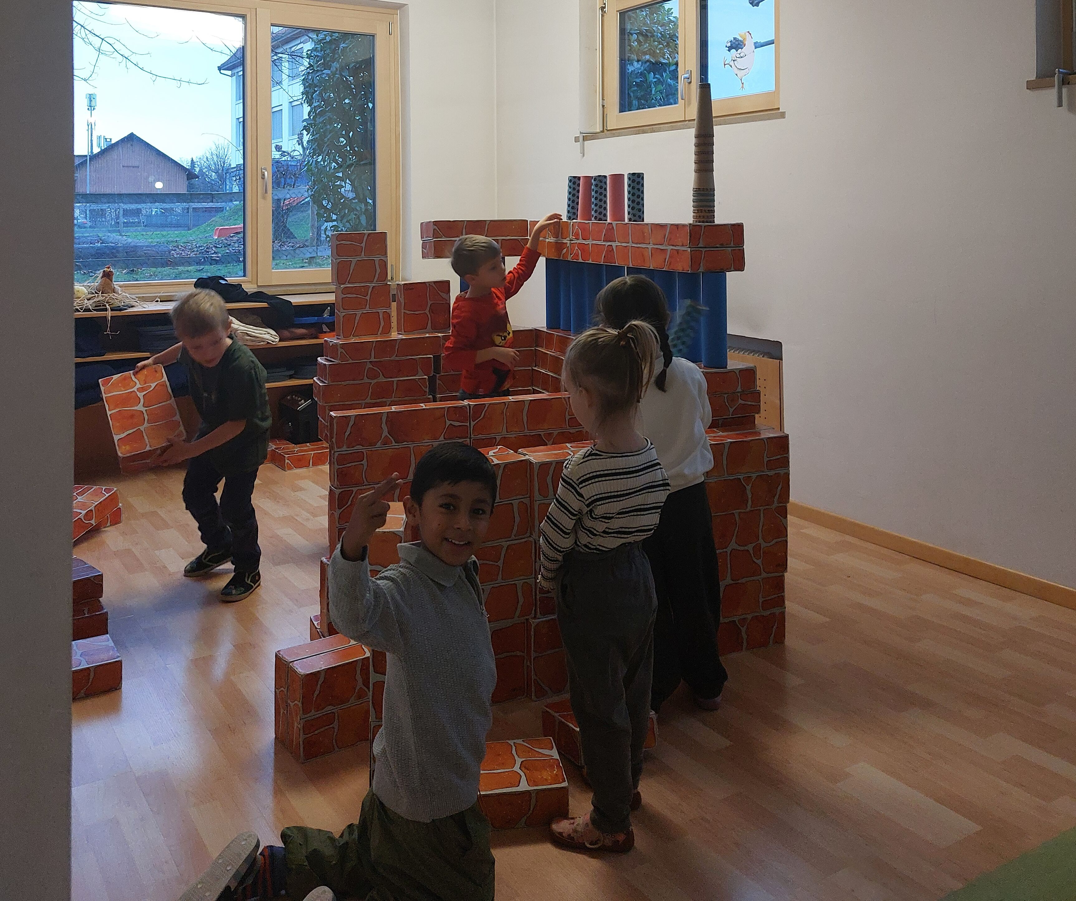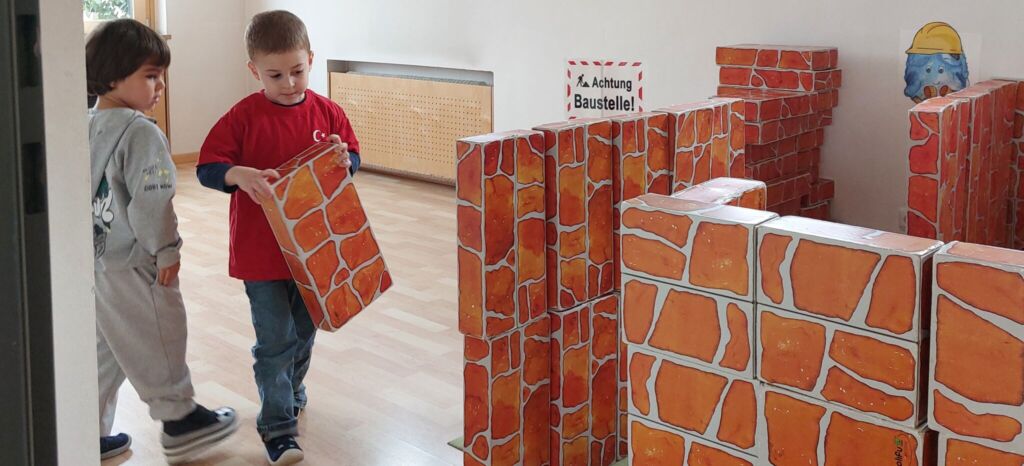 Das ganze Bewegungsräumle ist nun eine große Bauecke, in der die Kinder sich komplett austoben dürfen. Mit unterschiedlichen Bauklötzen und Röhren können die Kinder ihren Fantasien freien Lauf lassen. Wir freuen uns auf die unterschiedlichsten Bauprojekte der Kinder.