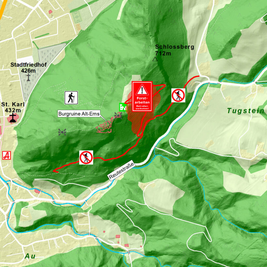 Im Bereich des Schlossbergs, Richtung Buchenau – Winzerstiege, erfolgt die Verjüngung mittels Seilbahn. Die Wanderwege von der Ruine Alt-Ems Richtung Buchenau sowie die Winzerstiege in Richtung Ruine Alt-Ems sind im Zeitraum von Mittwoch, 29. April 2026, bis Freitag, 15. Mai 2026, jeweils an Werktagen in der Zeit von 7 bis 19 Uhr generell gesperrt. Achtung: Es besteht Lebensgefahr durch Stein- und Holzschlag.