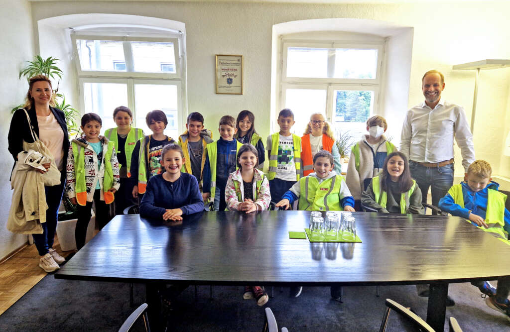 Nach einer kurzen Begrüßung im Sitzungszimmer folgte ein Besuch im Büro des Bürgermeisters, wo Dieter Egger den Kindern auf ihre vorbereiteten Fragen Rede und Antwort stand und sich viel Zeit nahm, den Mädchen und Jungs Einblicke in seine tägliche Arbeit und die seiner Mitarbeiter zu geben. Nach dem gemeinsamen Foto „belohnte“ der Chef die Schüler mit „der längsten Praline der Welt“.