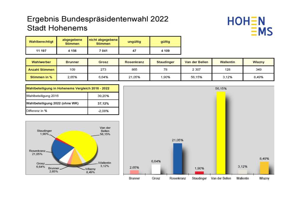 In Hohenems beteiligten sich am vergangenen Sonntag 37,12 % der Wähler an der Wahl des neuen Bundespräsidenten. Nicht berücksichtigt sind dabei die vielen Wahlkartenwähler.