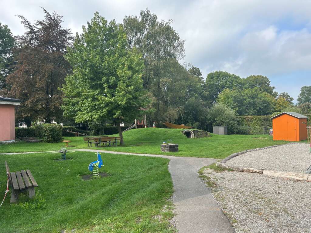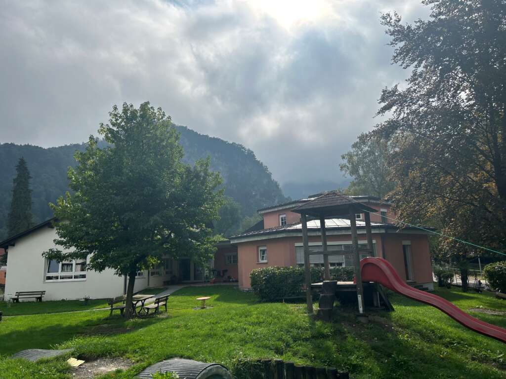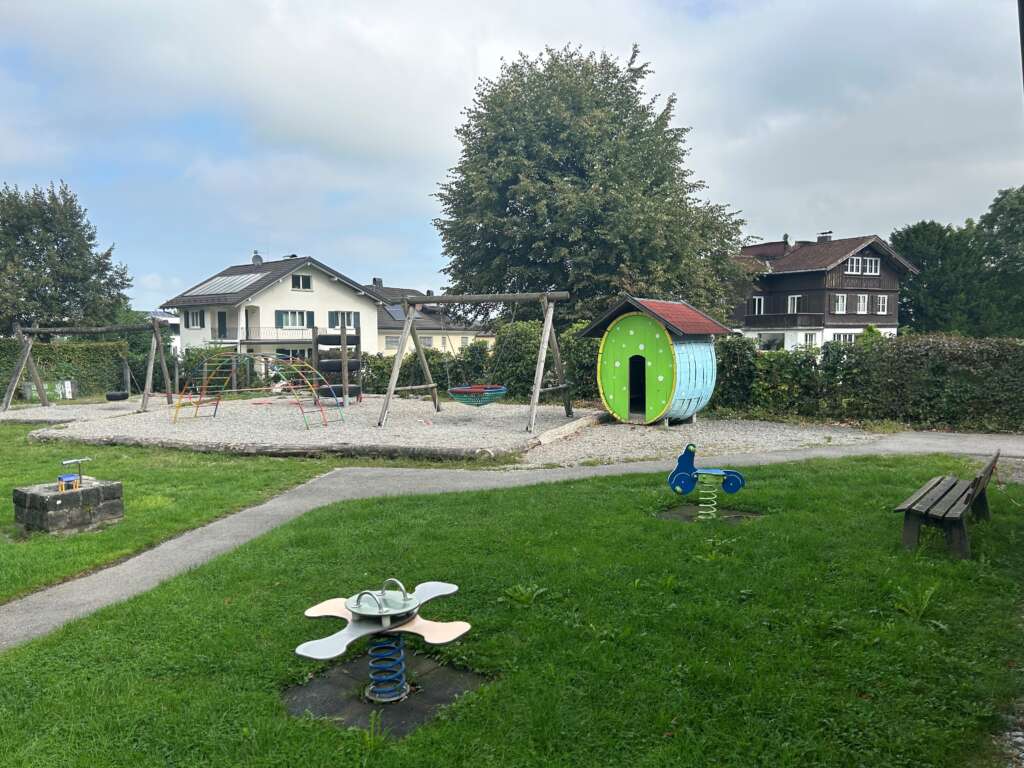 Neben den vier Gruppenräumen verfügt der Kindergarten über einen Bewegungsraum, drei Ausweichräume, eine Küche, ein Büro und diverse Nebenräume. Zum offenen, hell und freundlich wirkenden Kindergarten gehört auch ein eigener großer Spielplatz. Der seit 1961 Jahren bestehende und somit älteste Kindergarten in Hohenems erhielt 1991 einen Zubau mit zwei Gruppen. 2013 wurde der alte Trakt renoviert. Die neue überdachte Terrasse bietet bei Regenwetter die Möglichkeit, sich im Freien aufzuhalten. In einer ehemaligen Personalwohnung ist Platz für jene Kinder, die im Kindergarten zu Mittag essen. Der große, schöne und vielfältige Garten ist ein zusätzliches Spiel- und Betätigungsfeld für die Kinder und wird ganzjährig genützt. Der zentral gelegene Turnsaal wird außerhalb der Kindergartenöffnungszeiten durch die Volkshochschule und die Musikschule mitbenützt.